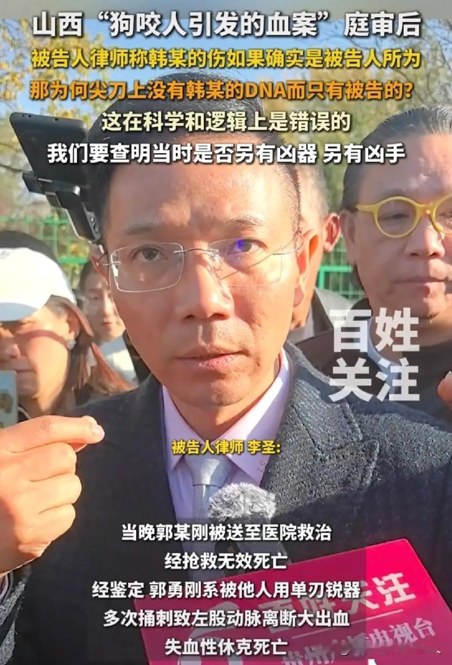 昨天山西狗咬人以后引发的血案进行了庭审,没有当庭宣判。 事发原因和经过,大家其实都已经非常清楚了。 但这里有一个疑点: 据被告律师在一审以后按受记者采访的时候说:如果韩某的伤是被告所为,那为什么那一把剔骨刀上没有韩某的DNA,只有被告自己的。 被告原来是一名杀猪匠,所以家里会有剔骨刀。 我们来还原一下当时的情况啊。狗主人带着一帮人来到被告人家里理论的时候,是在晚上,当时的环境非常昏暗,人又特别多。 双方不是在吵架,而是扭打在一起。。可以想象得出来,当时的现场会有多混乱。 有没有这种可能,自己的队友刺到了自己人,误伤。 毕竟现场人多又看不清,一顿乱挥,刺到了谁自己都不知道。 如果是这样的话,那就说明狗主人的一方,是手持凶器有备而来的,被告方大概率是正当防卫了。 因为韩某的伤如果是被告人刺的,刀尖上肯定会检测到韩某的DNA,但现在没有。 这就说明现场还有其他的凶器没有找到,韩某的伤,是被其他的人刺伤的。 这个凶器存不存在,是不是被人有意藏起来了,我们现在还不知道,只是凭猜想。 一切都以法院判决为准,再等等吧!