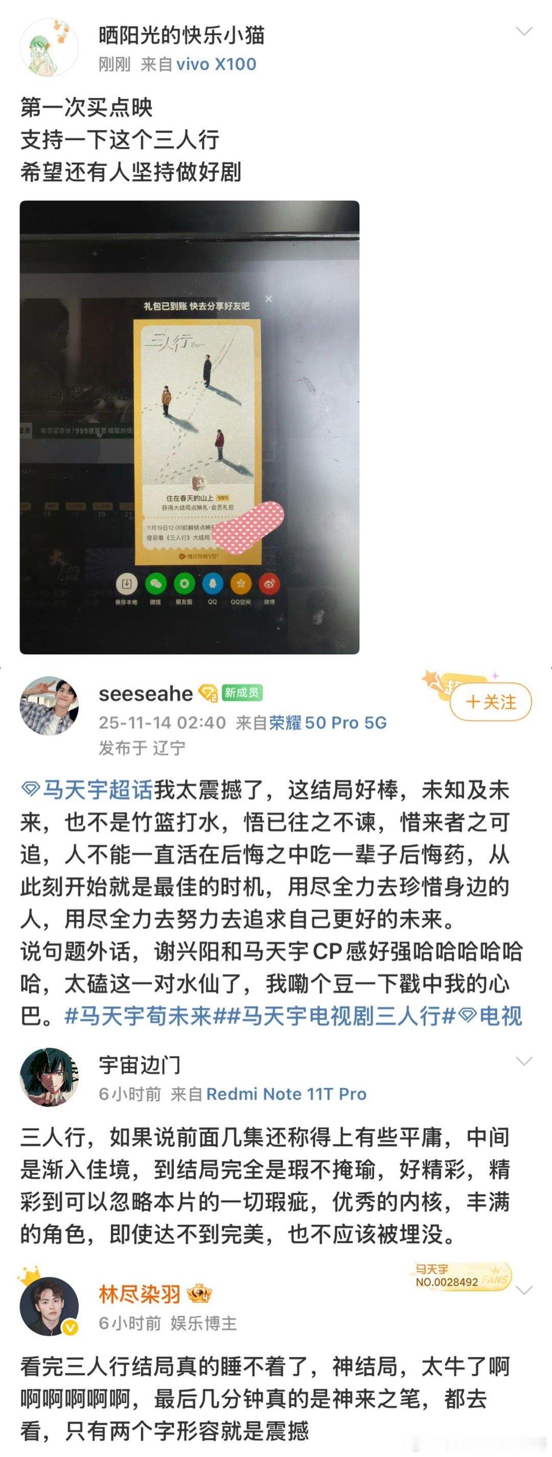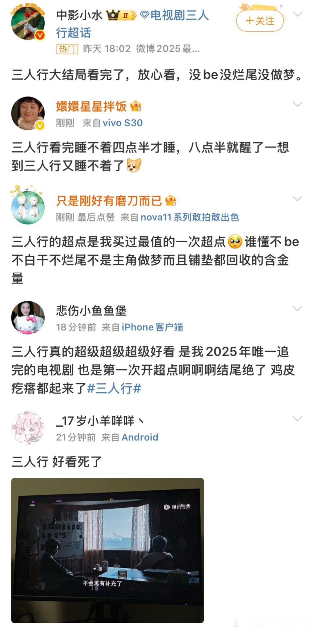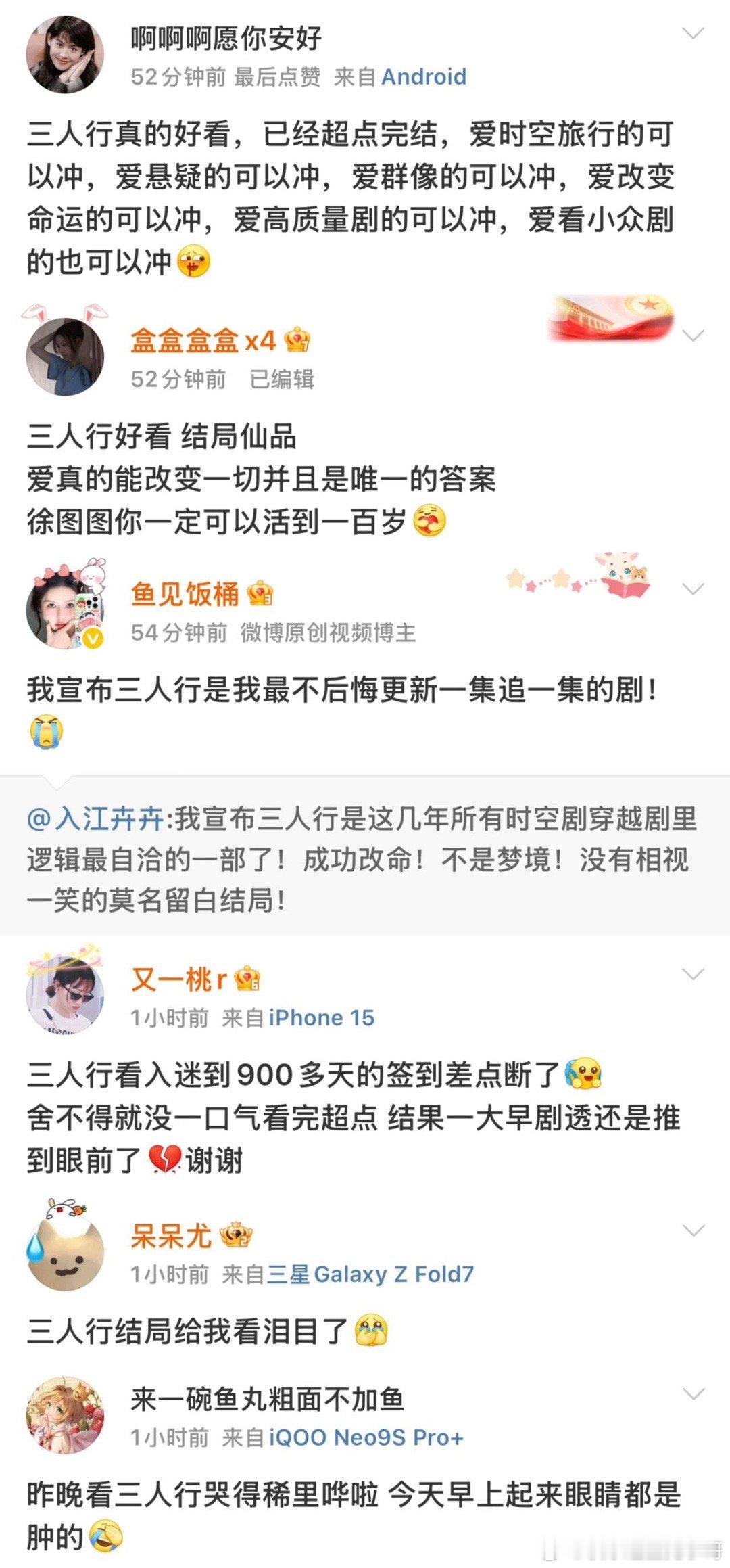 都给我去看《三人行》!这剧后劲太大了!昨天看完超点一晚上都在回味!!别人家编剧挖坑不填,它家是填得漂漂亮亮还有惊喜!真穿越+蝴蝶效应,让每个人的命运都有迹可循,这逻辑闭环简直舒适! 能从头好到尾不是没道理的,信我,这绝对是你的下一部“电子榨菜”!