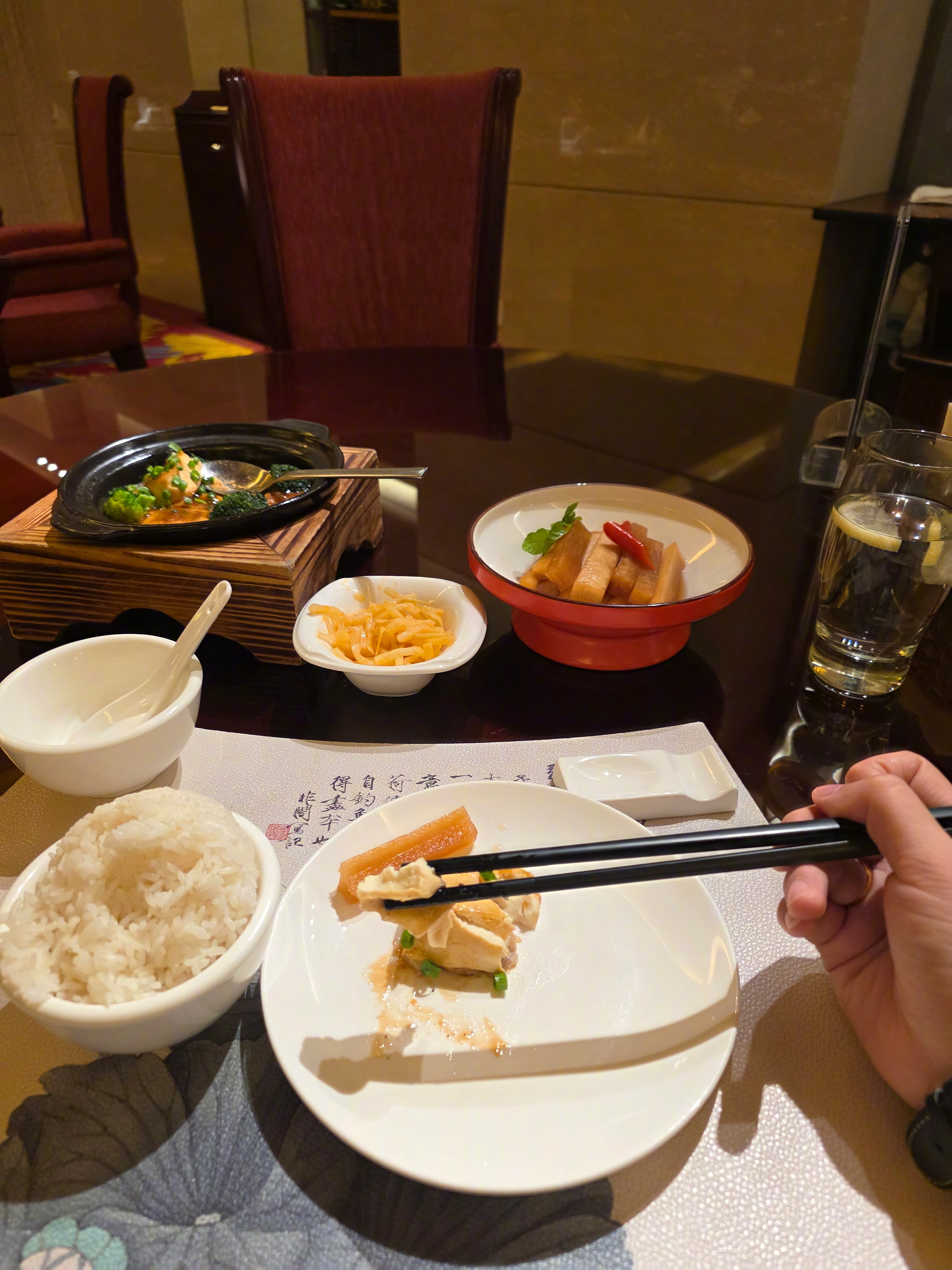 自己一个人,在机场酒店,发现叫外卖很远,楼下餐厅随便吃好一点吧,大家猜猜我这一份米饭一个热菜一个凉菜一杯柠檬水,多少钱???