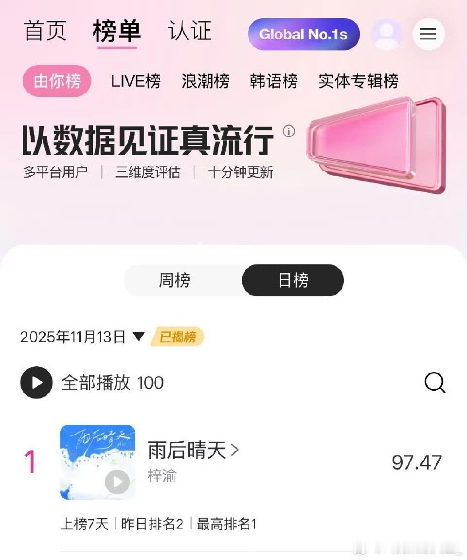 这个由你榜单,梓渝一直都是第一,出新歌就第一,这还怎么玩