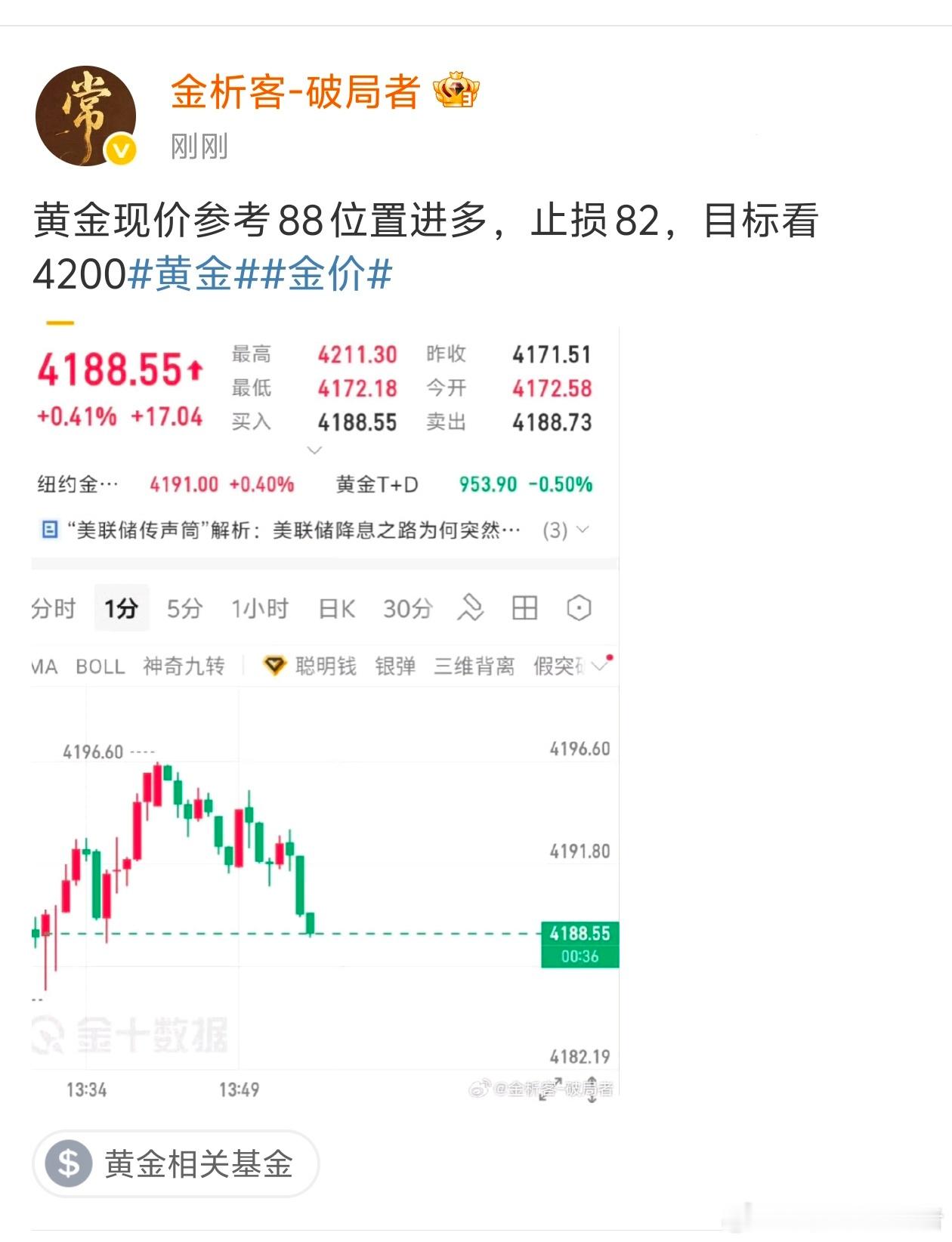 黄金4188位置多单进场已收割50点利润温馨提醒:场外兄弟们注意护利,不要贪心,稳健盈利