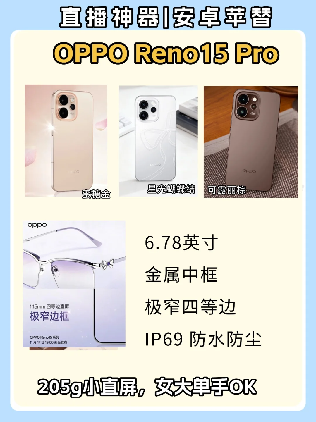 Reno15 Pro有三款配色,蜜糖金、星光蝴蝶结、可露丽棕,采用运动芭蕾美学,6.78英寸的1.15mm极窄四等边手机,仅205g小直屏,女大单手长时间握都很轻松。