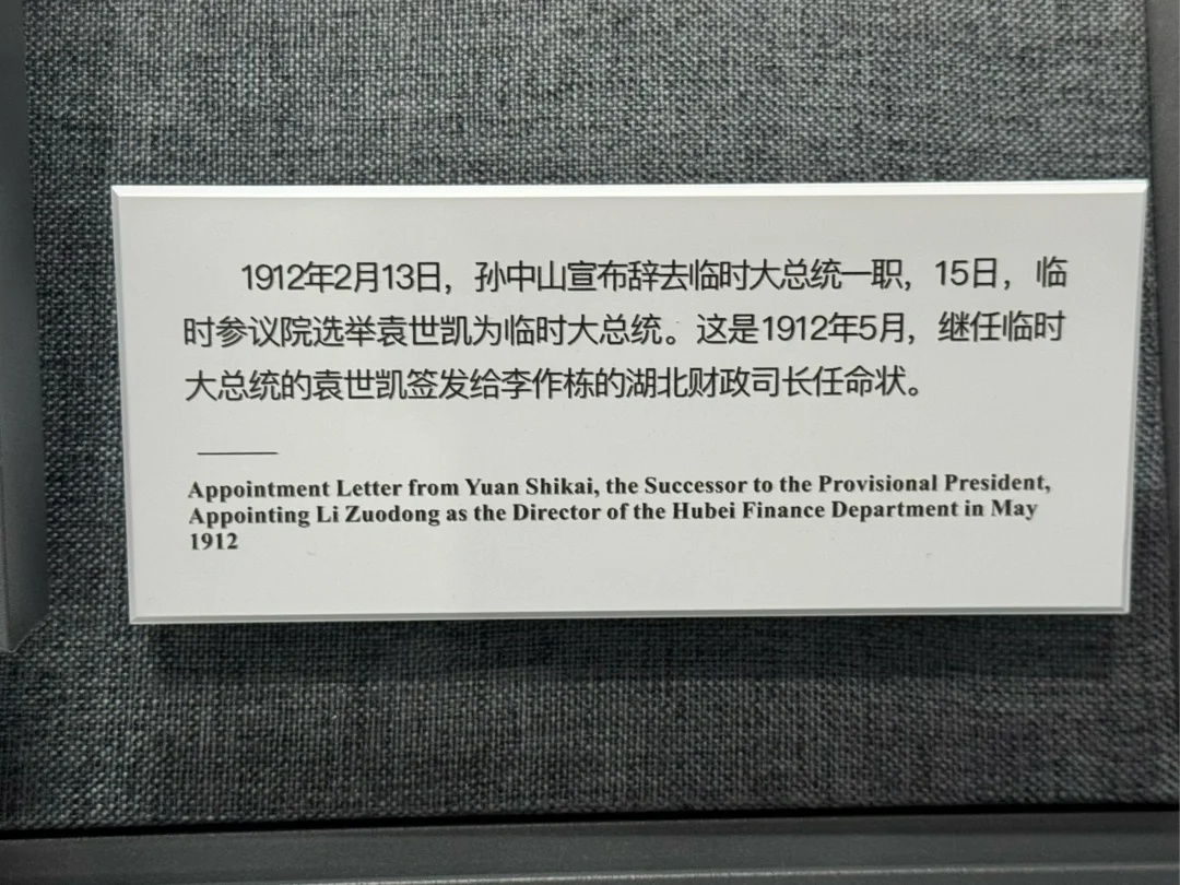 2. 文物归属与相关配套文物:该委任状由李作栋的夫人捐赠给了湖北省博物馆,如今常与黎元洪签发给李作栋的勋四位证书、勋四位章等文物一同被相关展览提及,成为佐证李作栋在辛亥革命及民国初期政治活动的重要实物凭证,也直观反映了民国初年地方官员任命的文书形制与流程。