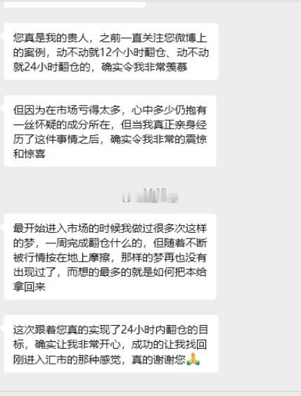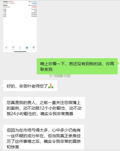 百万战队再添一位成功提交收米申请的淘金者(第11位)因为涉及到一些隐私的问题,这位实盘好友特意告诉叶生不得把姓名和头像给打出来,但为了持续更新我们百万战队的情况,叶生我只好出此下策只把聊天内容和操作的记录分享出来,让大家可以直观看到仅仅凭借什么样的神策就完成翻身之举。这不仅仅是一次账户的增值,更是团队对金融的专业性以及无私的奉献精神,这是团队的日夜心血,每一次布局都是由数十人深入探讨而出,每一单都是能带着我们胜利的希望,我们的职责就是为了给大家拿下成果、创造收获,让你们能过上更好的生活,仅此。