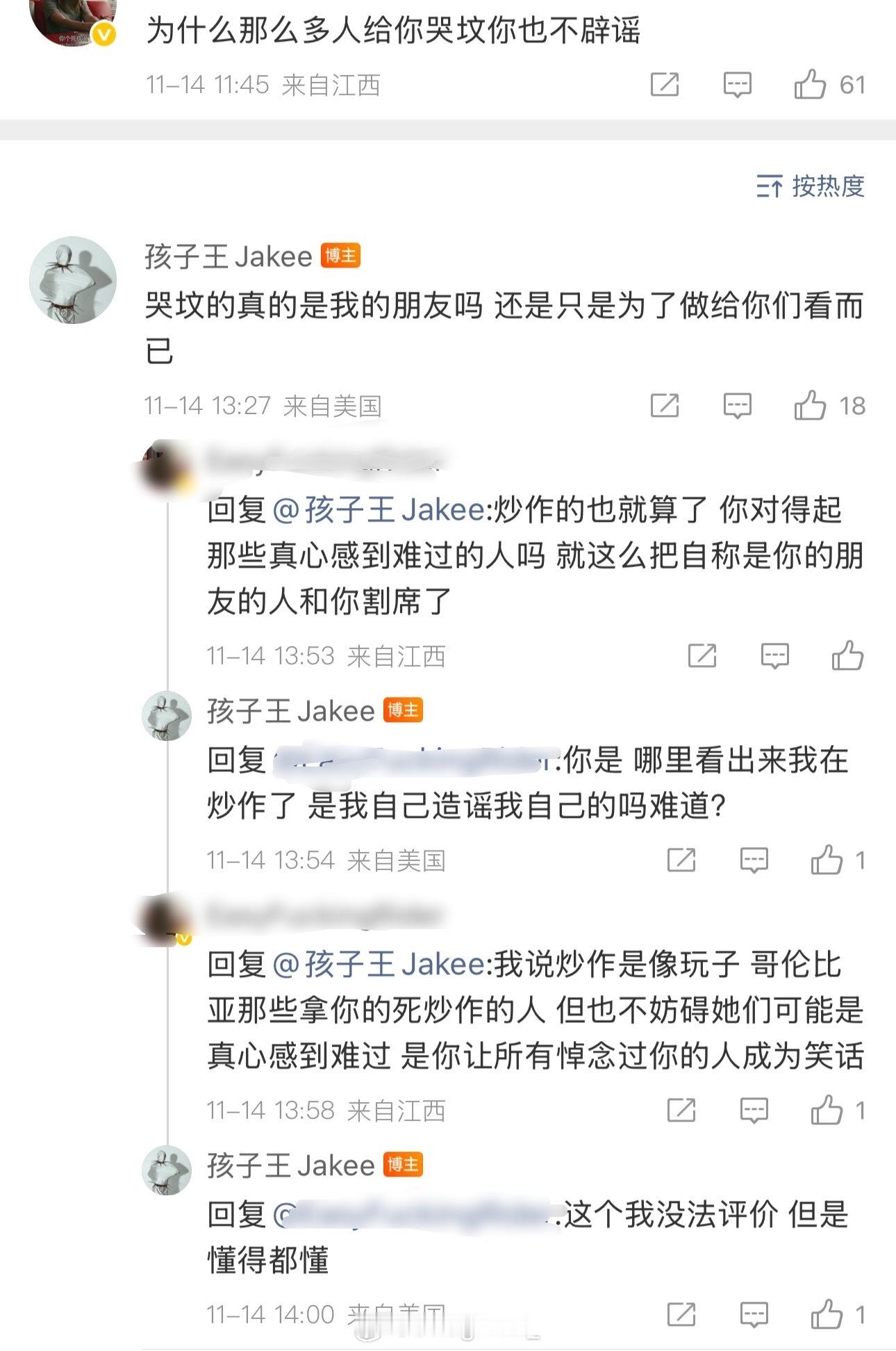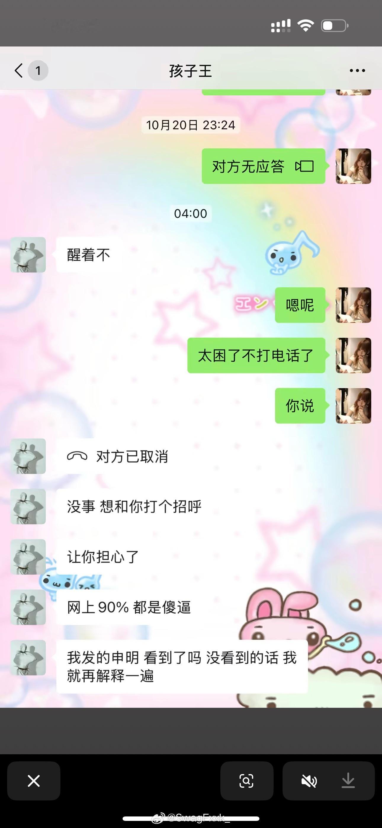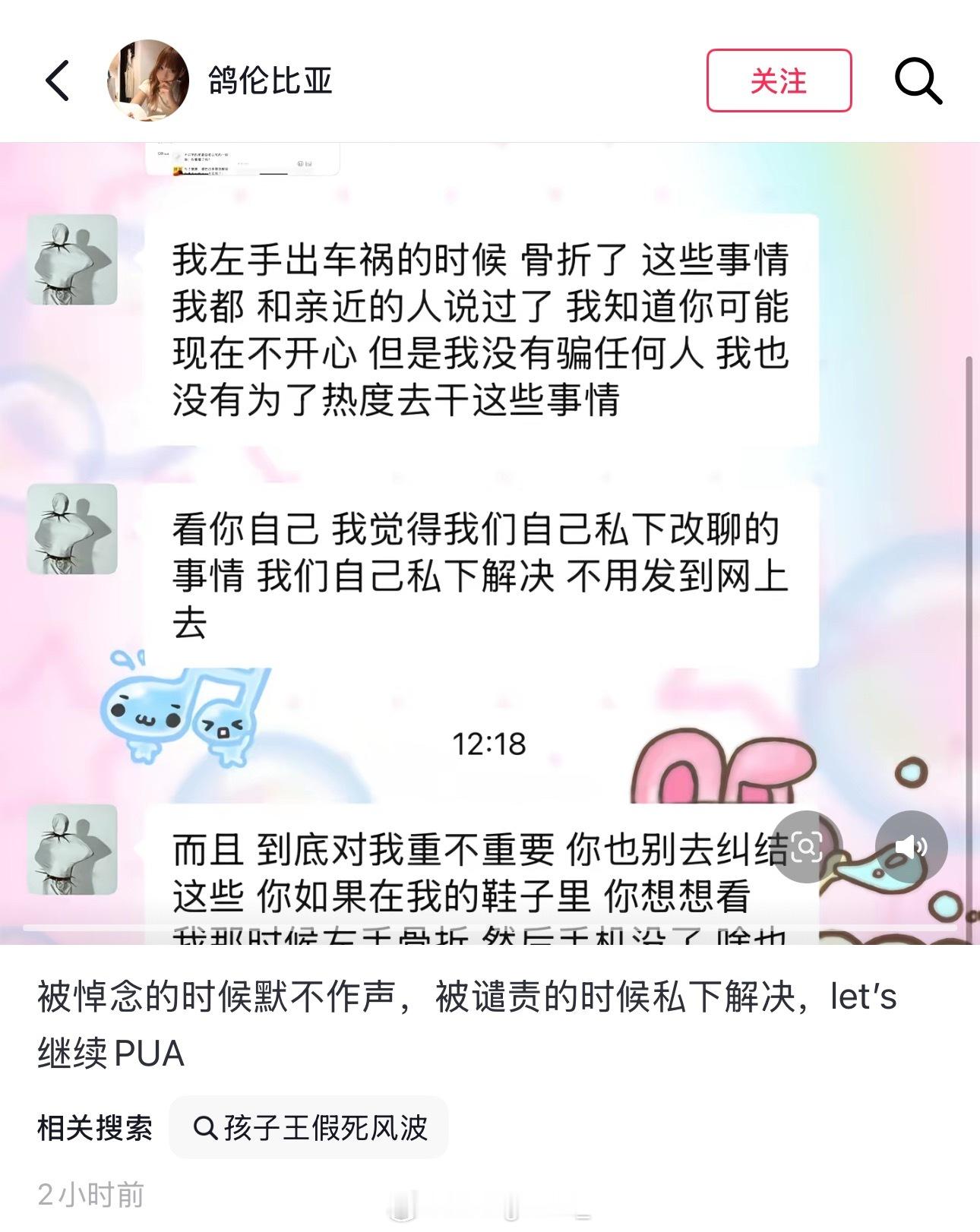 此前在孩子王“去世”时发视频痛哭的鸽伦比亚,晒出和孩子王的聊天记录开怼孩子王:“被悼念的时候默不作声,被谴责的时候私下解决,lets继续PUA”孩子王今天曾回应那些“哭坟”的人,表示懂得都懂。