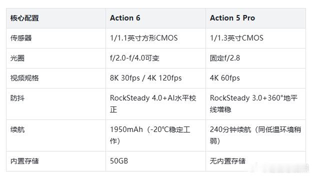 刚入Action 5 Pro就刷到Action 6发布的宝子举个手!哭晕啦那新旧旗舰对决,这波升级香不香?值不值得购买呢?且听我慢慢道来!首先来看看Action 6最香的6大升级1.可变光圈黑科技:运动相机圈头回有f/2.0-f/4.0无级调节!夜景开f/2.0噪点直接砍半,简单的说夜景拍摄变得更强了,夜景画质跟噪点更少。2.大底传感器画质飞跃:1/1.1英寸方形CMOS比5 Pro大60%,日光下树皮裂纹、路牌文字都清晰到炸,暗光环境4K视频再也不会满屏颗粒3.4K自由裁切自由:方形传感器加持,一次拍摄横竖屏随意切,Vlog博主再也不用纠结构图,还支持2倍无损变焦,细节拉满4.存储&功能大升级:内置50GB存储无卡也能拍,新增人像模式、手势控制,胶片滤镜直出复古感,连AI防抖都比前代稳30%5.8K录制解锁新玩法:30fps 8K+HDR规格,后期裁切一半仍有4K清晰度,极限运动抓拍再也不用取舍构图和细节6.收音体验优化:风噪抑制提升30%,搭配OsmoAudio双麦直连,双人Vlog收音也清清楚楚,现在不是工作使用,其实都不需要额外购买麦克风。那这么多升级,相对的价格肯定也相对的贵一点2998,不知道这个价格宝子们能不能接受,个人觉得会有点小贵!以下也是我的购买建议💰必冲党:夜景拍摄多、爱拍极限运动、做专业Vlog的宝子,可变光圈+8K+大底的组合,直接把画质上限拉满,2998元标准版闭眼入纠结党:如果只拍日常记录,二手5 Pro 1300-1500元很划算,但要接受暗光噪点和固定光圈的局限等等党:若不是刚需,可蹲双十二套装优惠或明年的618,畅拍套装(含3块电池)性价比会更高
