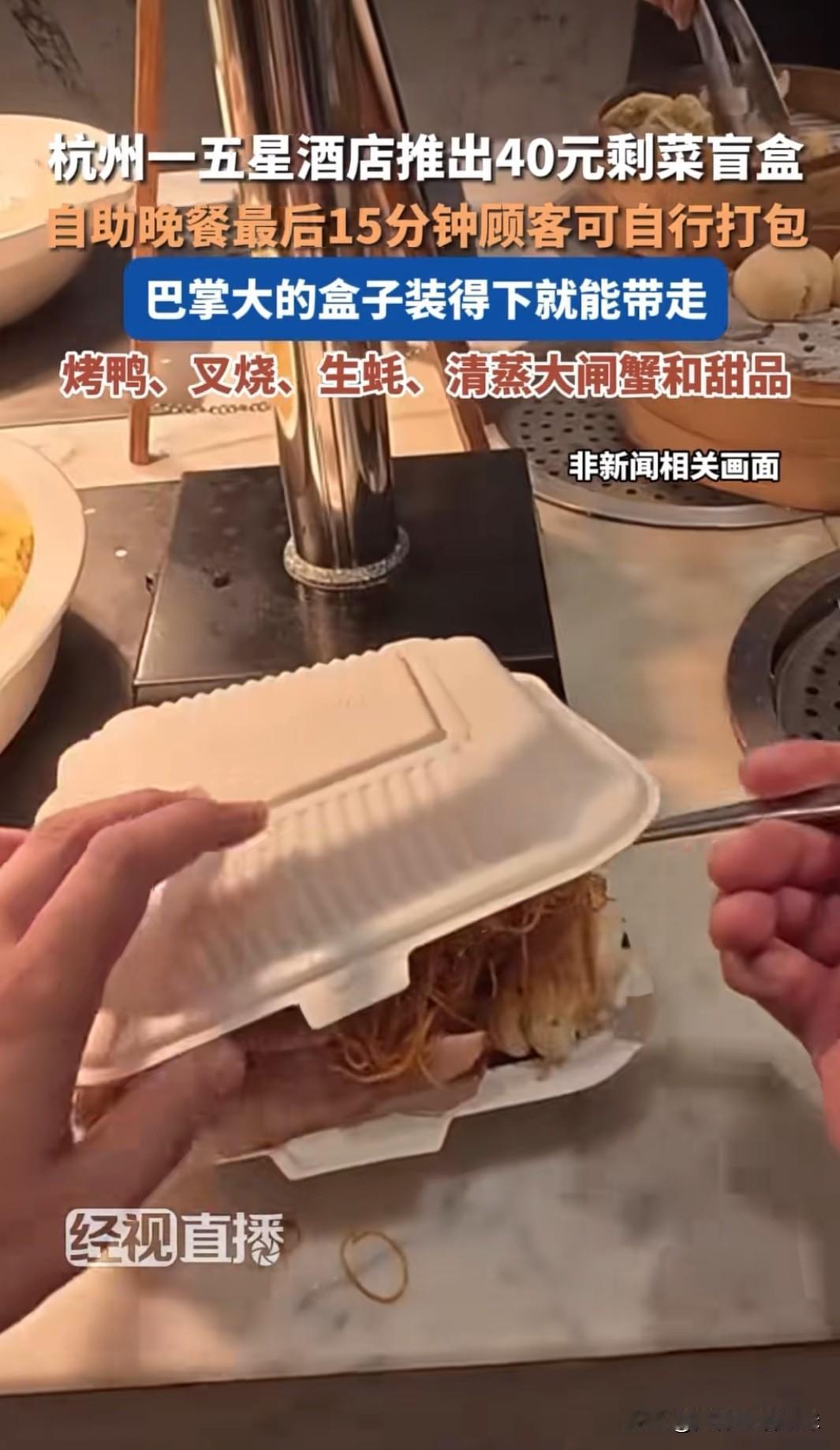 杭州一家五星级酒店上大分了,推出自助餐40元剩菜盲盒,里面有烤鸭、生蚝、清蒸大闸蟹。 是自助晚餐最后15分钟所有来店顾客可花费40元自助打包,虽然打包盲盒有手掌那么大,这个意义可不简单,要知道自助酒店每天的备菜,吃不完就得倒掉,决不卖隔夜菜。 杭州这家酒店推出自助餐盲盒,是很不错的点子,既解决了剩菜浪费问题,又能让很多人花费很小的价钱吃到五星级酒店几百块的自助餐,咱就说说是不是很值得? 有网友表示担心,觉得会不会是客人吃剩的,服务员再搜刮一遍,然后再卖出来的剩菜盲盒。 对此,大家怎么看待?