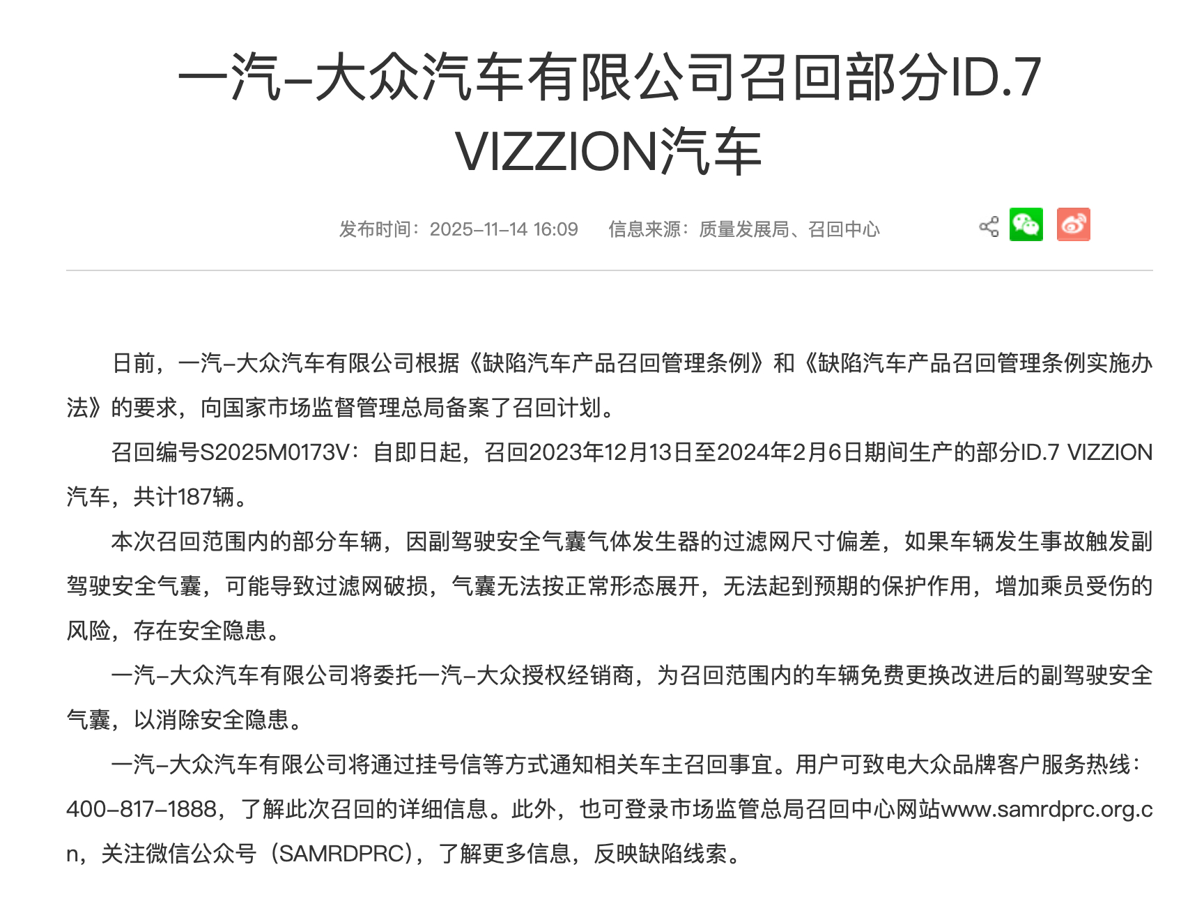 气囊无法按正常形态展开,一汽-大众ID.7 VIZZION召回。