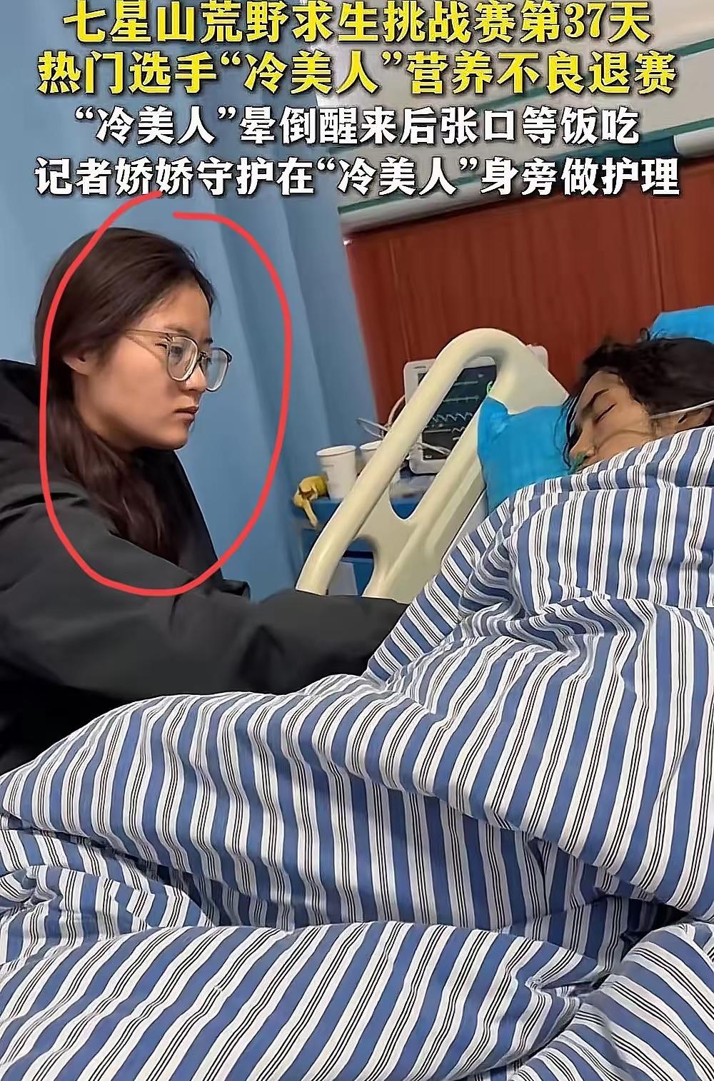 冷美人被抬下了山,强制退赛。这个照顾她的人还蛮让人意外的!不是她的家人,也不是主办方的工作人员,而是新闻记者娇娇。 娇娇守在冷美人床边,没有拿话筒,戴了副大眼镜,一看就是着急赶来帮忙的。看直播的时候就觉得这个记者挺不错的,采访很接地气,不容易冷场,跟选手之间的对话也是有来有回的。 更重要的是,她不会因为选手的热度而厚此薄彼,她对每一位选手都很热情,让人感觉很真诚。老六还喊话说自己是娇娇的粉丝,等自己进决赛了,给娇娇盖一个更好的房子。不止是老六,里面被采访过的好多选手应该都挺喜欢她的吧。 有这么细腻的人在冷美人身边,她肯定会快点好起来的,退了也好,好多人还等着她的个人直播呢! 网友纷纷表示: 娇娇也太圈粉了吧!记者当得有温度,不追热度只走心,冷美人有她照顾真的太安心了,退赛虽遗憾但有这样的善意超暖~ 她是单亲妈妈,永远不要低估一个母亲的力量,她说过想给孩子一个好的生活环境,不管输赢,她的这个精神支柱是她唯一坚持下去的动力和理由。 真的是太拼了,不能拿什么来当儿戏啊,要是冷美人的妈妈看到了得有多心疼啊!