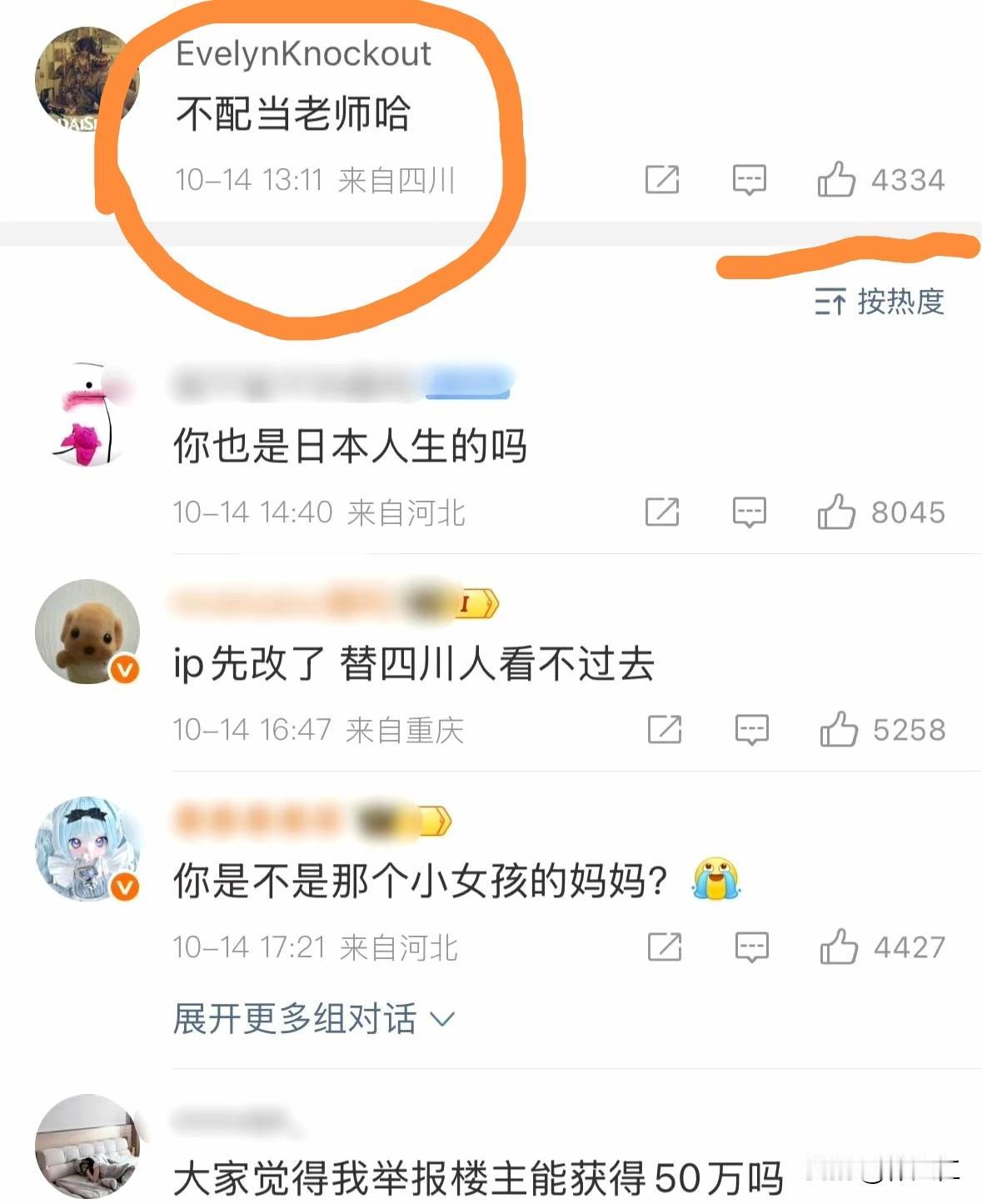 语文老师讲解了一篇关于抗日战争的课文,并顺势提及日军所犯下的罪行,结果竟被一位中日混血学生的母亲举报了,如图1。 而后,在这条微博的评论区,有个人留言道: “不配当老师哈”,如图2。 关键在于,这条评论居然获得了4千多个赞。 我去,怎么会有这么多精日分子帮着日本人说话,还不许我们讲述历史?[哆啦A梦害怕]