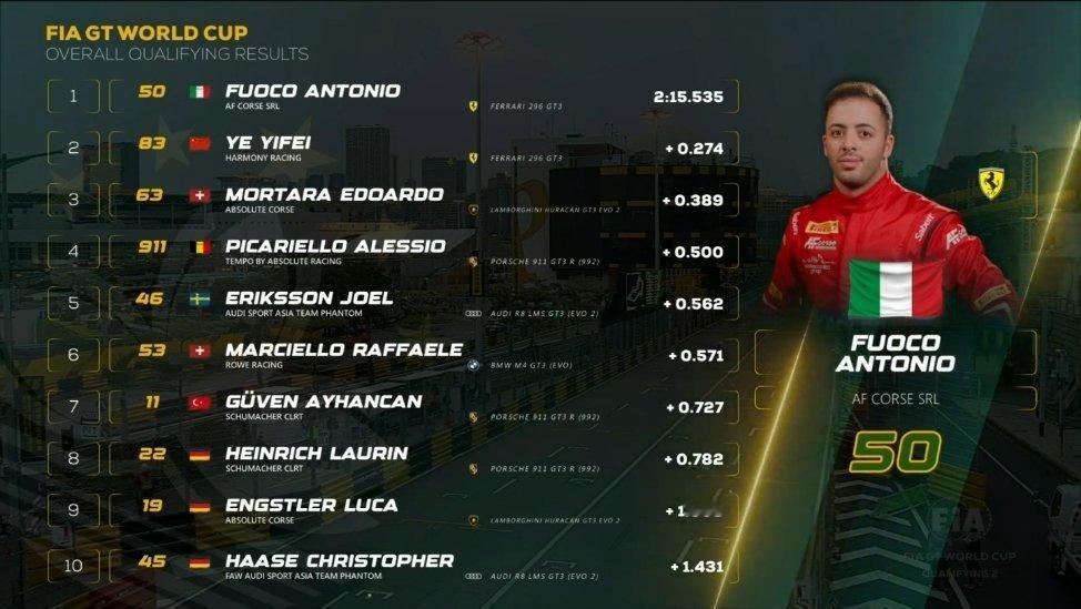 2025年国际汽联GT世界杯超级杆位赛&排位赛结束🔚【超级杆位赛 杆位】AF Corse SRL的50号法拉利296 GT3赛车(由法拉利厂队车手Antonio Fuoco驾驶)【超级杆位赛 第二】Harmony Racing的83号法拉利296 GT3赛车(由法拉利厂队车手-中国🇨🇳车手叶一飞驾驶)【超级杆位赛 第三】Absolute Corse的63号兰博基尼Huracan GT3 Evo2赛车(由兰博基尼厂队车手Edoardo Mortara驾驶)法拉利包揽前排! ! !———————————————————————中国🇨🇳香港🇭🇰车手方骏宇驾驶大耳狗涂装的Uno Racing Team的36号奥迪R8 LMS GT3 Evo2赛车排在全场第13位中国🇨🇳车手邓亿驾驶驾驶Winhere Motorsport的37号法拉利296 GT3赛车排在全场第15位