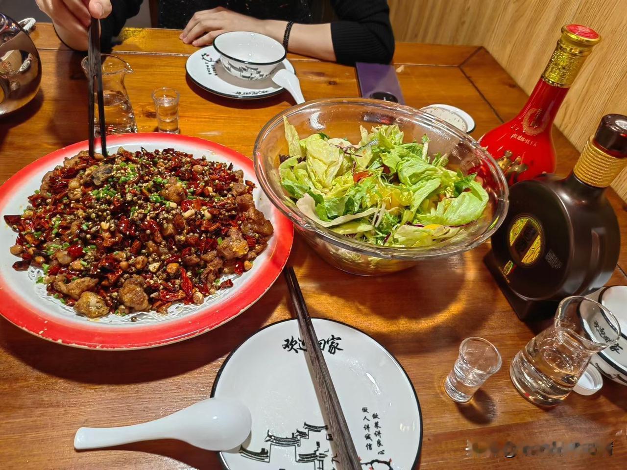周末跟闺蜜小聚一下,太得劲了!你看这盘里的辣子鸡🐔,裹满着辣椒花椒,光瞅着就够味儿,咬上一口又香又麻。旁边一大盆生菜刚好解辣,再配着小酒,跟闺蜜小酌几杯,这氛围不聊到深夜都不算完!餐具上还写着“欢迎回家”,馆子的设计氛围还挺暖的,这顿吃完指定得扶墙出了[捂脸]