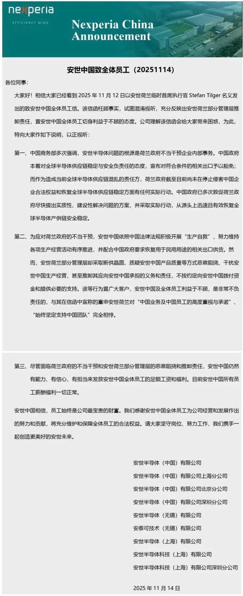 11月14日,安世中国发布全员信。信中称,尽管面临荷兰政府的不当干预和安世荷兰部分管理层的恶意阻挠和推卸责任,安世中国仍然有能力、有信心、有担当来发放安世中国全体员工的足额工资和福利。目前安世中国所有员工薪酬福利一切正常。