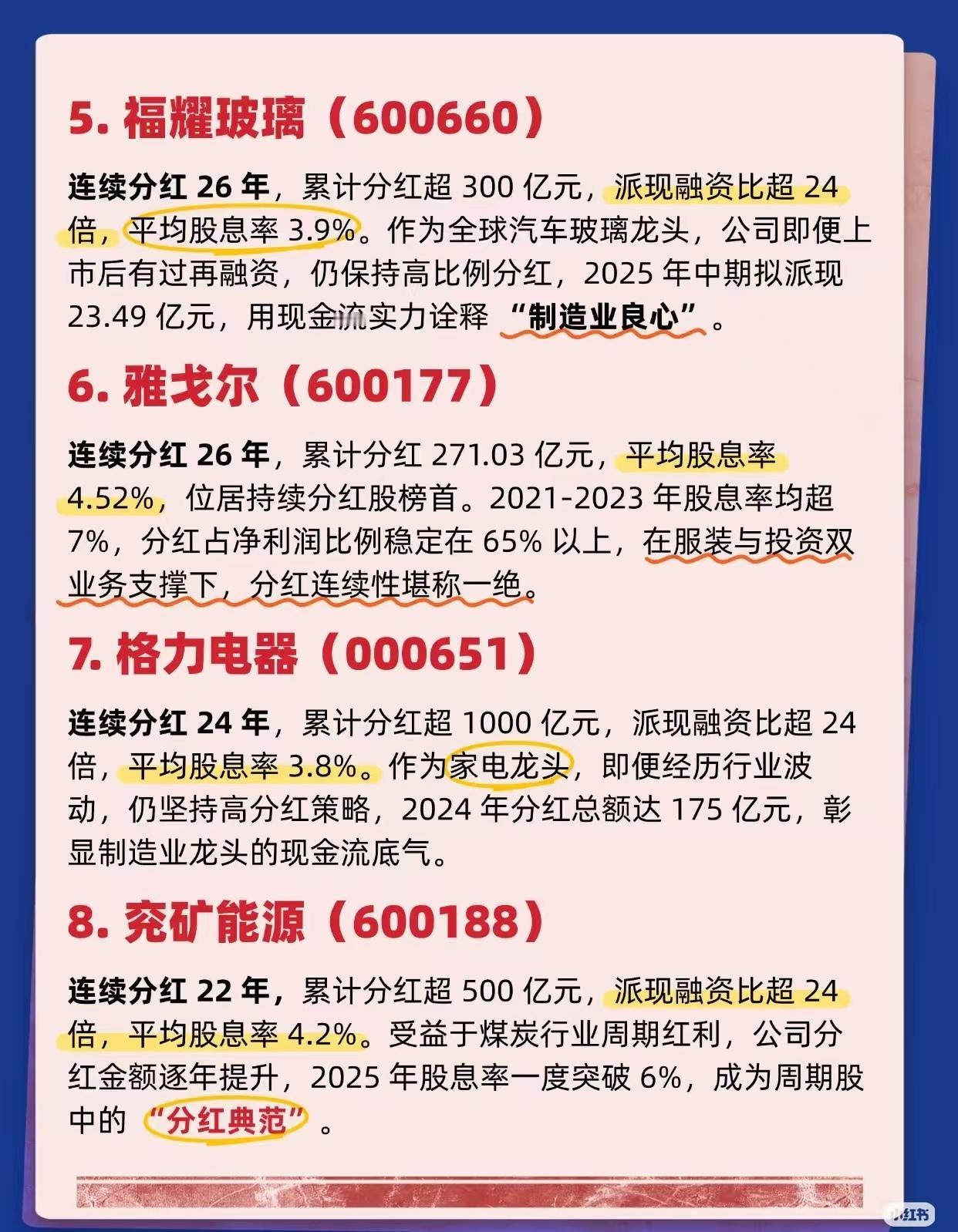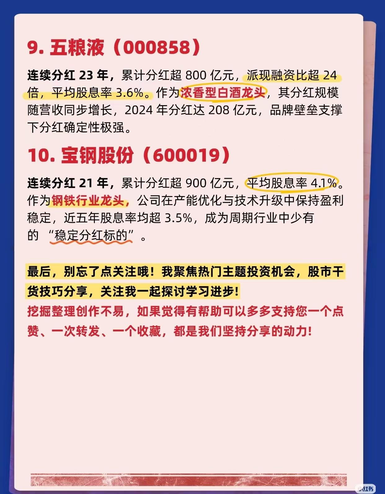 连续超20年高分红的良心公司名单 根据证券时报网2024年5月的报道,目前A股中自上市以来保持持续派现且持续派现不少于20年的公司有80家 。其中平均股息率超3.5%的公司只有这10家! 在A股市场,连续分红超20年,平均股息率超3.5%的公司有“分红一哥”贵州茅台、油气巨头中国石化、基建黑马宁沪高速、白酒龙头山西汾酒、“钢铁侠”宝钢股份、煤炭龙头兖矿能源等等,它们覆盖多个行业,有的派现融资比超600%,有的股息率稳定亮眼。 宝钢股份:全球碳钢品种最为齐全的钢铁企业之一,公司连续分红年数为21年,平均股息率为4.17%,2024年股息率为4.46%。(国企改革概念+航母概念+一带一路概念等等) 理财有风险入市需谨慎,资料取材网络仅供参考不能作为投资依据!高股息股 高股息核心龙头