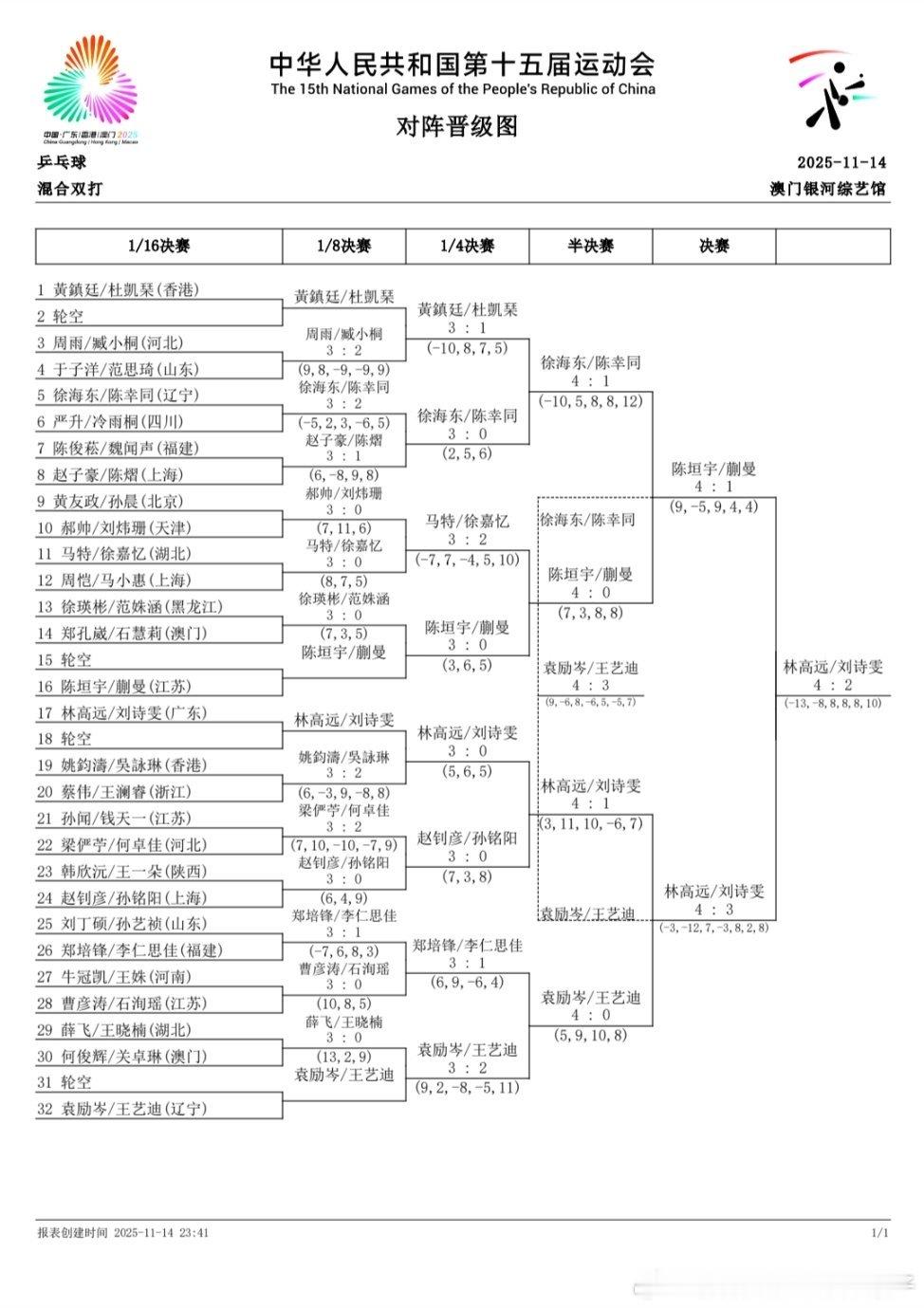 2025年第十五届全运会乒乓球混双成绩公告:冠军🥇:林高远刘诗雯(广东队)教练:张超亚军🥈:陈垣宇蒯曼(江苏队)教练:单明杰季军🥉:袁励岑王艺迪(辽宁队)教练:翟一鸣第四名:徐海东陈幸同(辽宁队)第五名:黄镇廷杜凯琹(中国香港队)第五名:马特徐嘉忆(湖北队)第五名:赵钊彦孙铭阳(上海队)第五名:郑培锋李仁思佳(福建队)