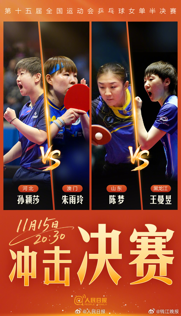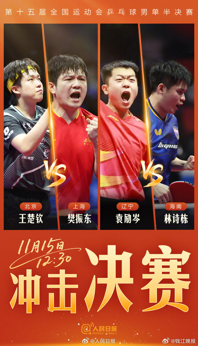 【冲击决赛!】11月15日,第十五届全国运动会乒乓球半决赛将进行,为运动员们加油!12:30 男单 VS VS20:30 女单 VS VS