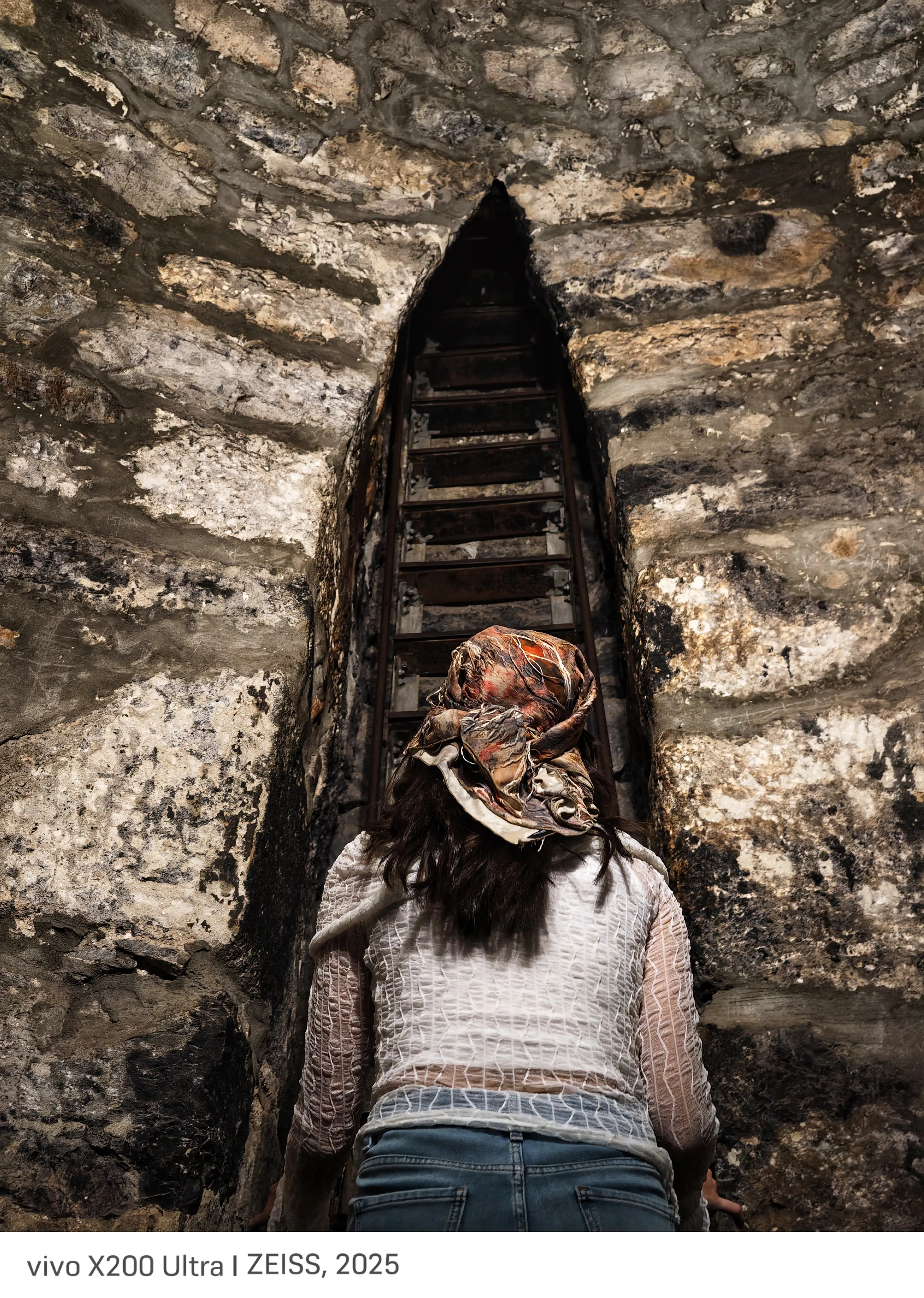 vivo X200 Ultra影像实拍分析~画面清晰展现人物服饰纹理、头巾细节与石墙的斑驳质感,明暗对比突出,石墙的纹理层次和金属梯子的细节都得到细腻呈现。此类石砌结构与狭窄通道常见于历史建筑或遗迹中,具有浓厚的历史探索氛围,常被用于展现人文探索的主题,具有较高的场景叙事价值。vivo X200 Ultra作为影像旗舰机型,搭载蔡司光学镜头,在人文场景的细节捕捉、光影控制上表现突出,适合拍摄具有历史感和探索感的人文题材,能精准呈现场景中的质感与氛围。