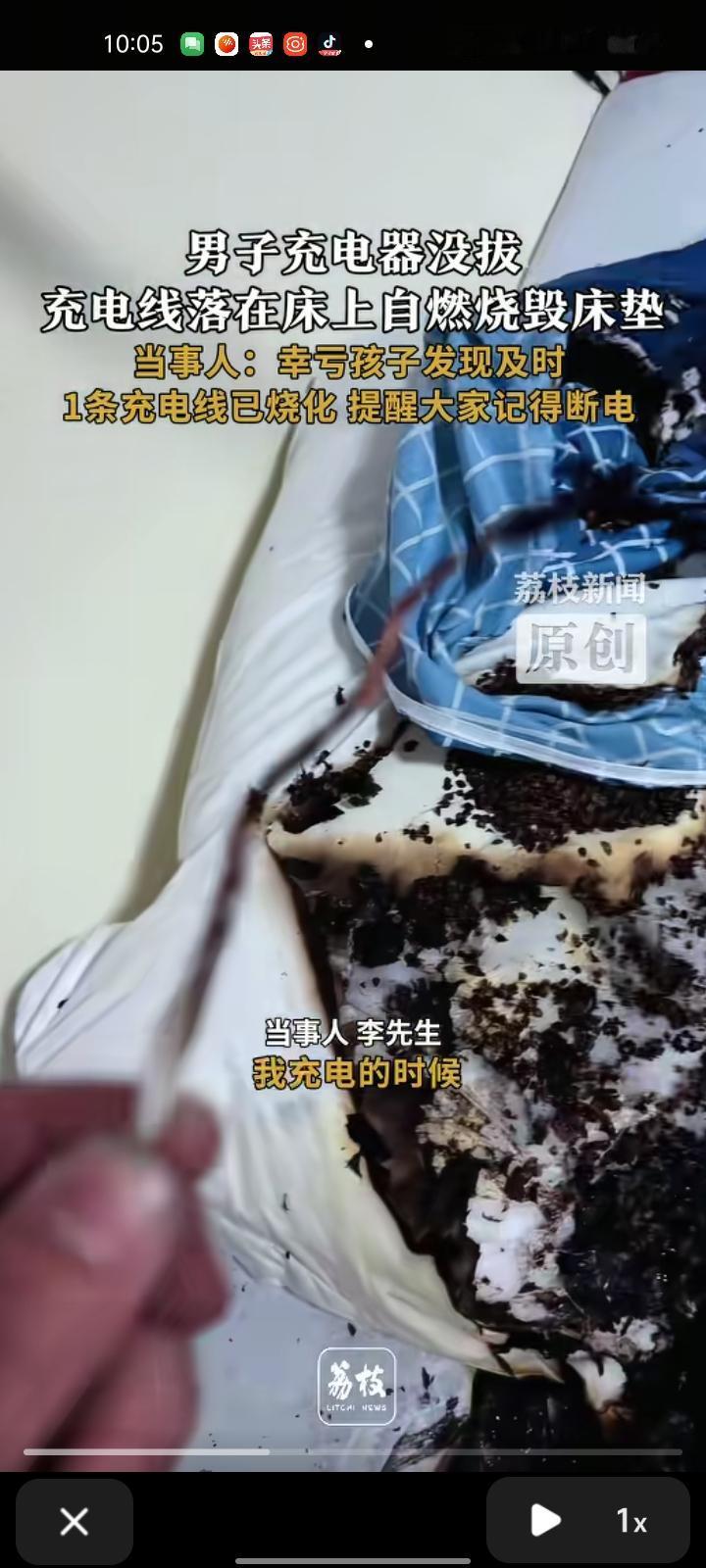 11月13日,重庆。男子没拔充电线,长时间处于通电状态放在床上导致自燃,床铺大面积点燃、烧黑。幸好孩子及时发现,有一根充电线被烧化。事后,男子提醒大家,用完就拔充电器,不能心存侥幸。