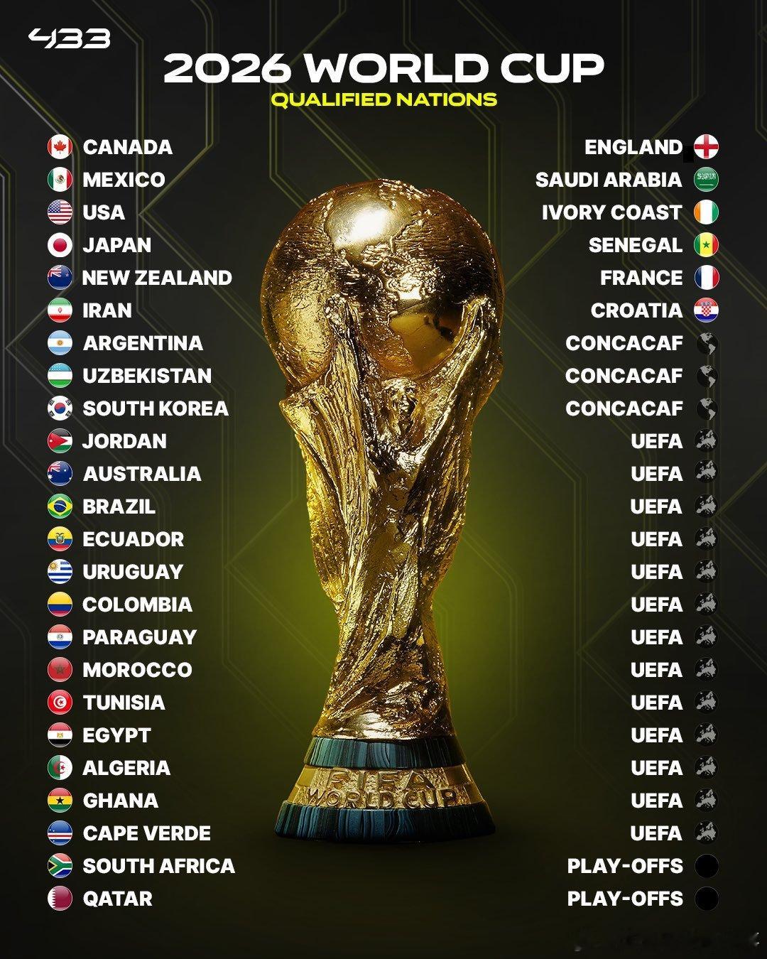 👇中北美及加勒比:美国、墨西哥、加拿大南美:阿根廷、巴西、厄瓜多尔、乌拉圭、巴拉圭、哥伦比亚亚洲:日本、伊朗、乌兹别克斯坦、韩国、约旦、澳大利亚、卡塔尔、沙特非洲:摩洛哥、突尼斯、埃及、阿尔及利亚、加纳、佛得角、南非、科特迪瓦、塞内加尔大洋洲:新西兰欧洲:英格兰、法国、克罗地亚