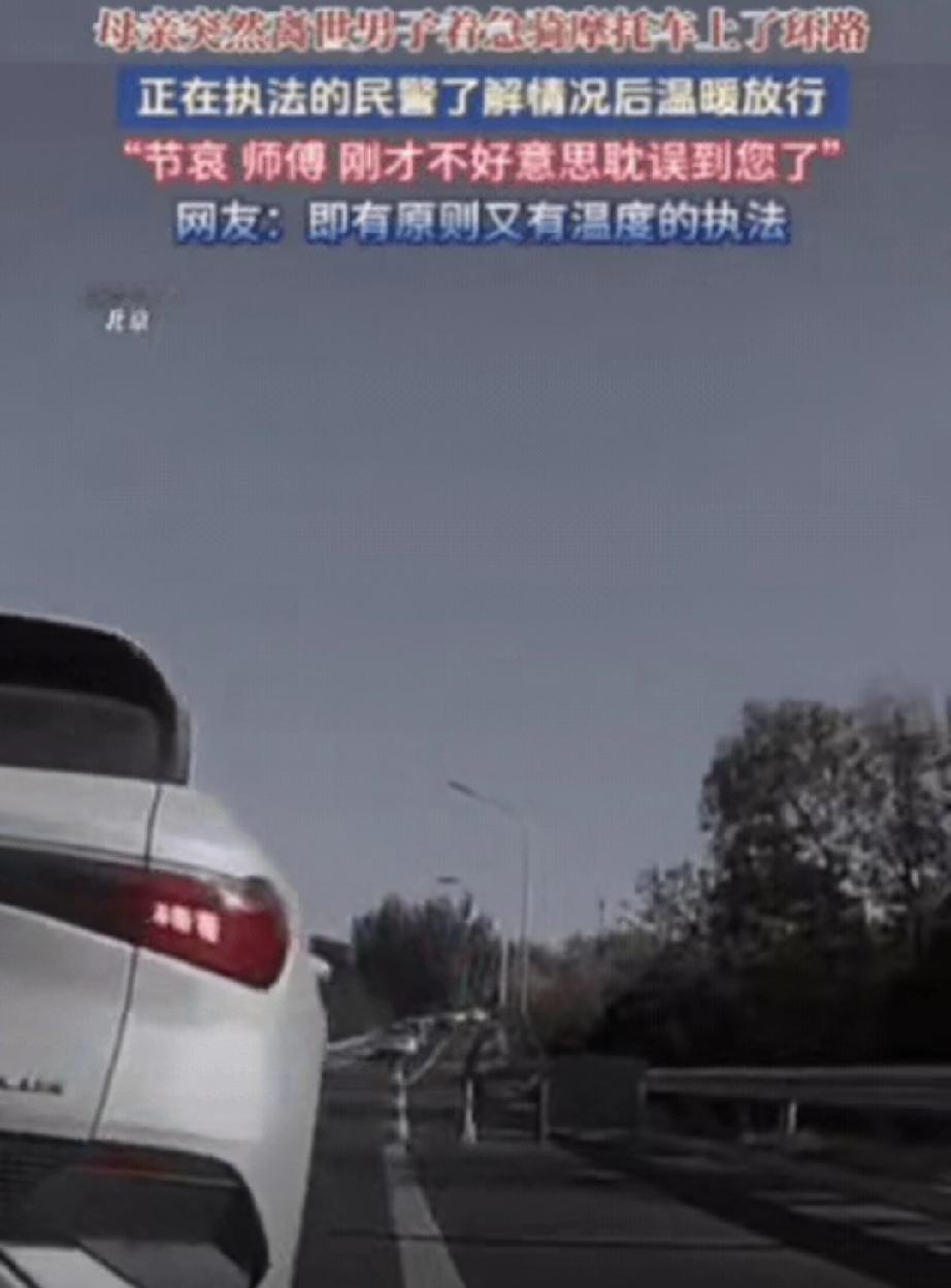 陆少游 泪目!北京一男子骑摩托上五环,被交警拦下后,男子竟然崩溃大哭:警官,我妈没了!我要看我妈去!我不是故意的我着急! 男子浑身都在发抖,手里紧紧攥着一部屏幕碎裂的手机,上面还停留在和家人的通话界面,语音消息里的哭喊声隔着屏幕都能让人揪心。他没戴头盔,头发被风吹得凌乱,眼眶红肿得像核桃,眼泪混着汗水顺着脸颊往下淌,滴在满是灰尘的骑行服上,晕开一小片深色印记。交警刚伸手示意他靠边时,他还想猛拧油门冲过去,可看清交警手势里的坚决,又猛地刹车,车把晃了好几下才稳住,那份绝望劲儿看着真让人心疼。 交警没立刻开罚单,而是上前拍了拍他的后背,声音放得特别轻柔。这举动太关键了,换谁遇到这种天塌下来的事,情绪都容易失控,硬来只会适得其反。男子哽咽着掏出身份证和手机里的亲属关系证明,说话断断续续,半天才能拼凑出完整意思——他在郊区打工,刚接到姐姐电话说母亲突发重病离世,想赶紧回市区见最后一面,情急之下才骑摩托上了五环。谁都能理解这份孝心,可规矩就是规矩,北京二三四五环主路本来就禁止摩托车通行,这不是针对谁,是为了所有人的安全。 有数据能说明问题,之前朝阳区东五环就发生过摩托车和公交车相撞的事故,摩托车主当场身亡,还牵连了多名公交乘客受伤,就是因为摩托车在主路行驶时灵活性不足,遇到突发情况根本来不及反应。按照规定,驾驶机动车违反禁令标志指示,要罚款100元记1分,这是《道路交通安全违法行为记分管理办法》里明确写的,交警完全可以按流程处罚。但现场交警没这么做,而是先通过对讲机联系指挥中心核实情况,又协调了就近的警车开道,让男子跟在后面走合规路线,这波操作既守住了法律底线,又有人情味,必须给交警点个赞! 这里就得说句实在的,男子的心情能共情,但做法真的不可取。紧急情况不是违规的理由,反而容易引发更大的危险,要是真出了事故,不仅见不到母亲最后一面,还得连累别人,得不偿失。其实遇到这种事有更稳妥的办法,全国统一的高速公路救援热线12122能提供应急引导,还能联系交警、医疗等部门协同处置,比自己硬闯靠谱多了。而且北京周六日不限号,要是能提前联系亲友接送,或者打正规网约车,既安全又不违规,何乐而不为? 很多人觉得“特殊情况特殊处理”就该完全免责,可交通规则的制定本来就是为了防范风险。要是每个人都凭着“着急”就突破规则,五环主路的交通秩序早就乱了,交通事故只会成倍增加。交警的处理方式已经给出了答案:执法不是冷冰冰的罚款扣分,而是在合法框架内尽可能提供帮助。这既体现了《道路交通安全违法行为处理程序规定》里“处罚与教育相结合”的原则,也让我们看到了执法的温度。 你有没有想过,要是当时男子强行冲卡,结果会怎么样?不仅可能被加重处罚,还可能引发连环车祸,让更多家庭陷入痛苦。遵守规则从来不是束缚,而是对自己和他人的负责。当然,也有人会说“规矩能不能更灵活点”,其实现在已经有很多应急渠道了,比如浙江就推出了“施救在线”小程序,能快速协调救援资源,北京也有类似的应急服务,关键是大家要知道怎么用。 法律是底线,人情是温度,两者并不冲突。交警的处置既没纵容违规行为,又解决了当事人的燃眉之急,这才是执法该有的样子。而我们普通人遇到紧急情况,更该冷静下来想合法合规的办法,别让着急冲昏了头脑,最后反而耽误了事情。 各位读者你们怎么看?欢迎在评论区讨论。
