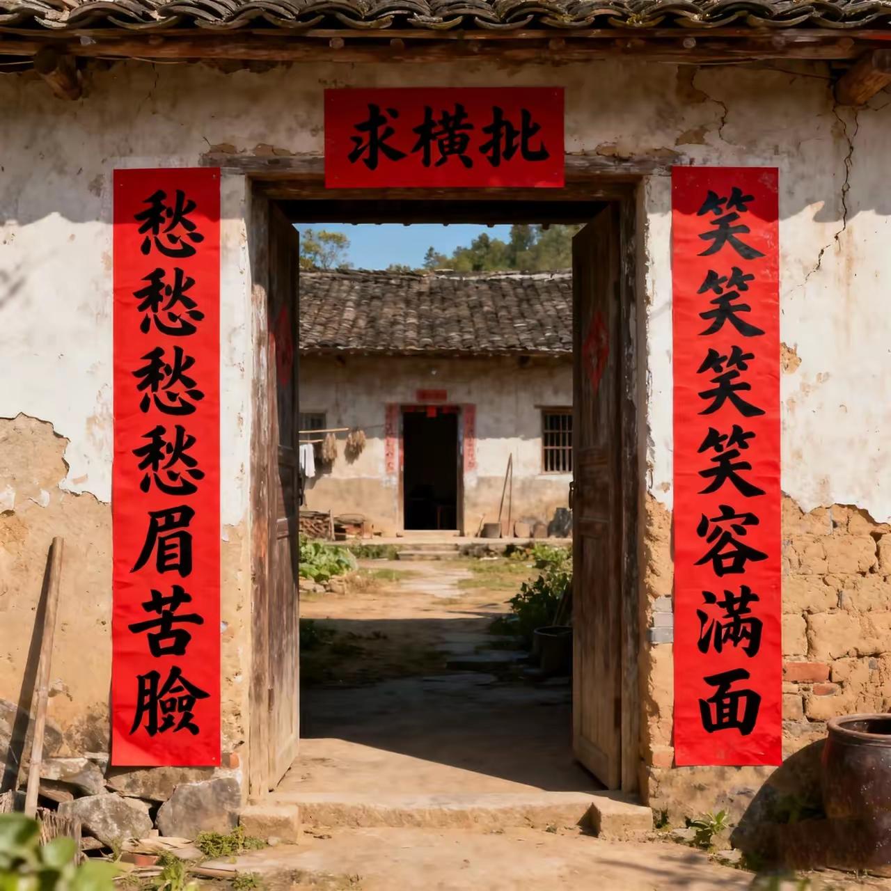 笑笑笑笑容满面 愁愁愁愁眉苦脸 据九江网友称,这副对联挂出半年有余,也没能找到适合这对联的横批:????