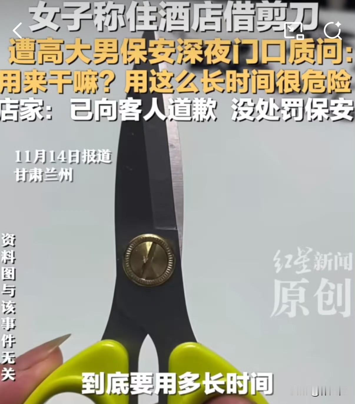 近日,一女子在社交媒体发布视频吐槽,她入住兰州一家名为“麗枫酒店”的酒店,晚上向前台借剪刀剪衣服,却遭遇一位高大男保安登门质问“用来干嘛?用这么长时间很危险”。店家表示,已向客人道歉,但并未处罚保安。 此事乍一看,保安的行为似乎“不近人情”,然而设身处地思考,当下从事服务业工作着实不易。 保安在借出剪刀前多询问几句,弄清楚用途,实则是对工作高度负责的体现。要明白,倘若这把剪刀借出去后,被用于自伤或伤害他人,酒店和当班保安都难辞其咎。 在当前的环境下,这位保安在核实情况后仍愿意把剪刀借出,已然算得上很有担当。依我看,从风险控制的角度而言,这类潜在危险物品干脆不外借才是最为稳妥的做法。虽说听起来有些“不近人情”,但能避免后续一系列不可控的风险。 做人艰难,做一个既负责又周到的好人,更是难上加难啊。