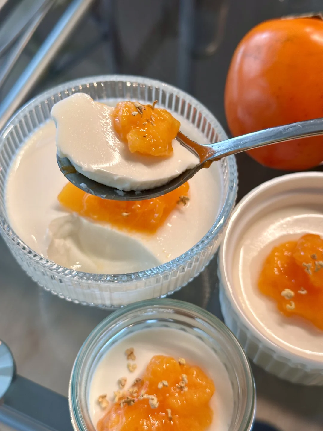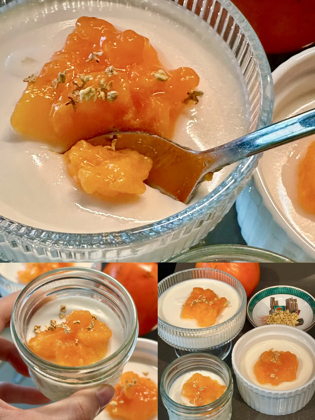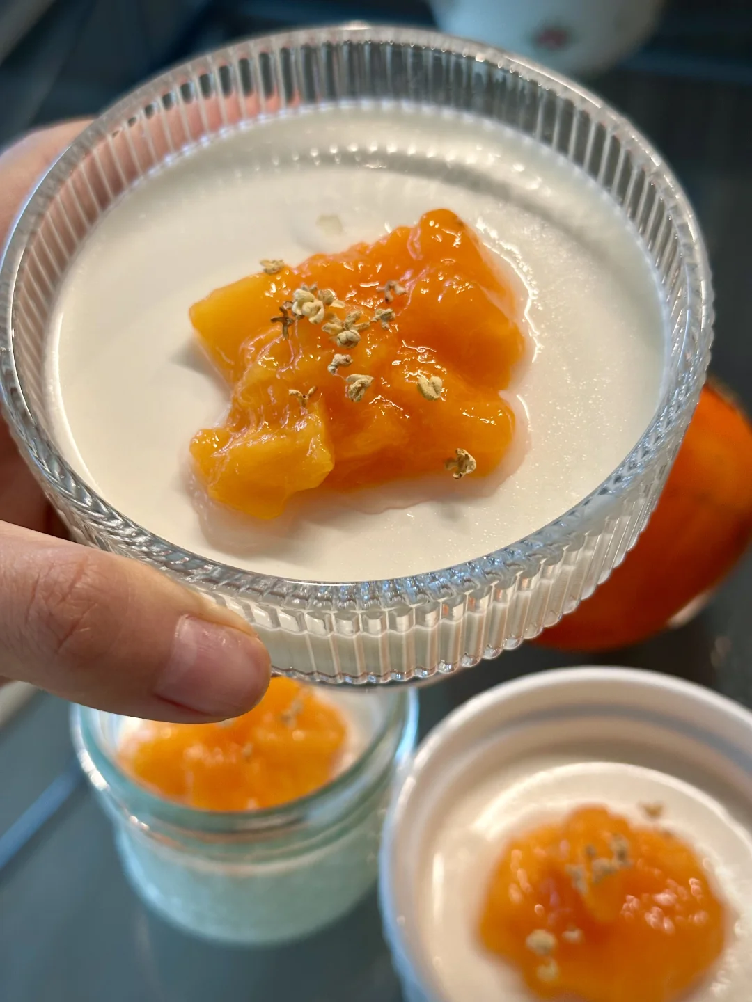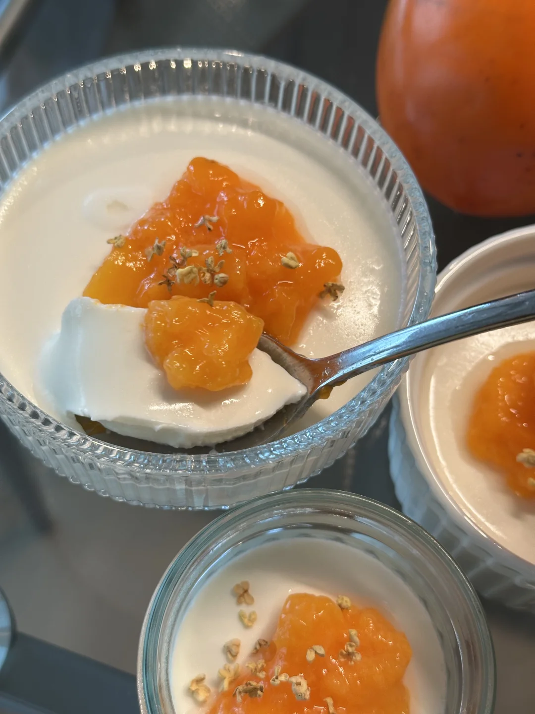 吃的时候用一枚甜柿,kuai出果肉盖在奶冻上,撒一点干桂花,就可以享用啦!