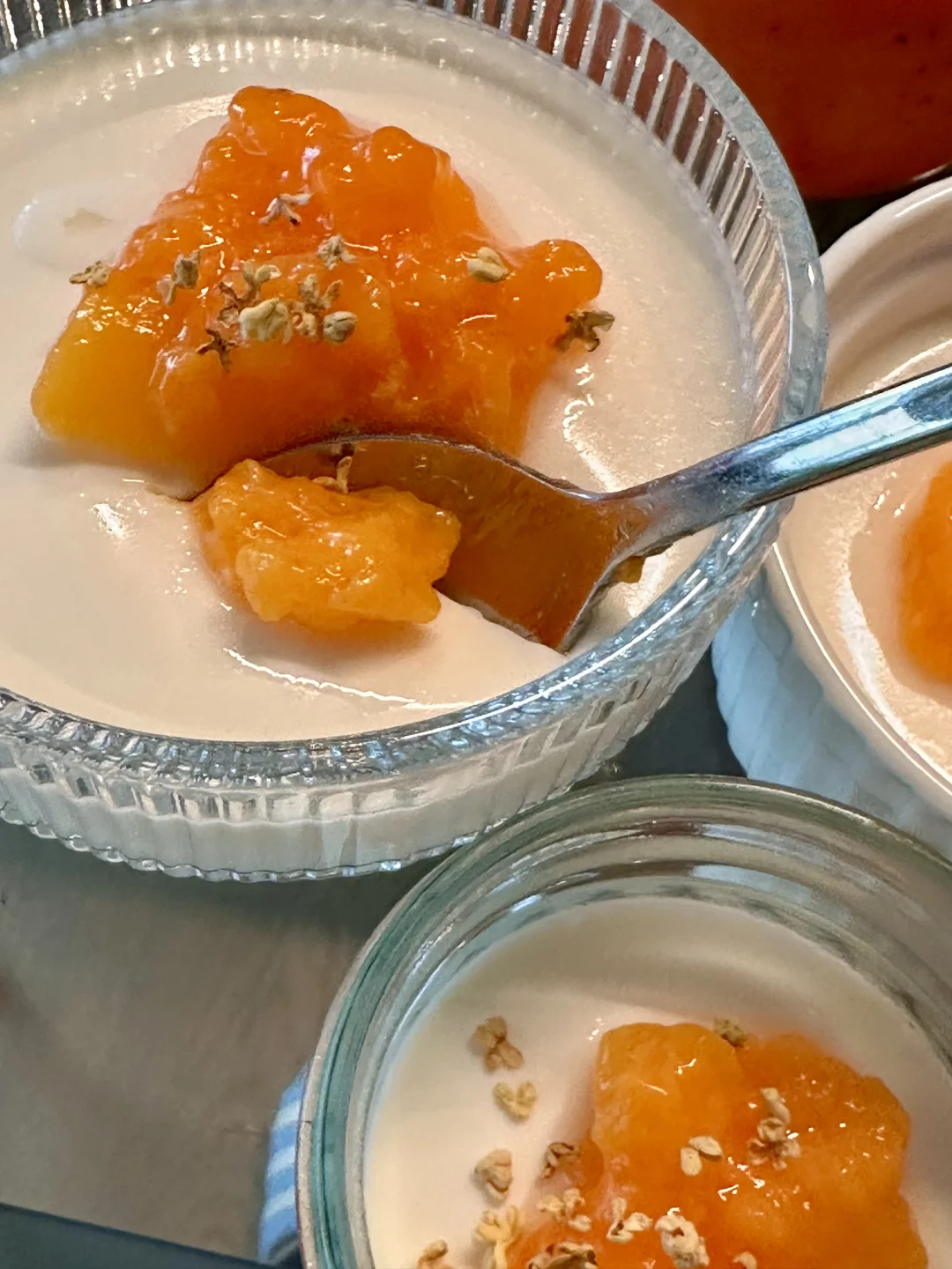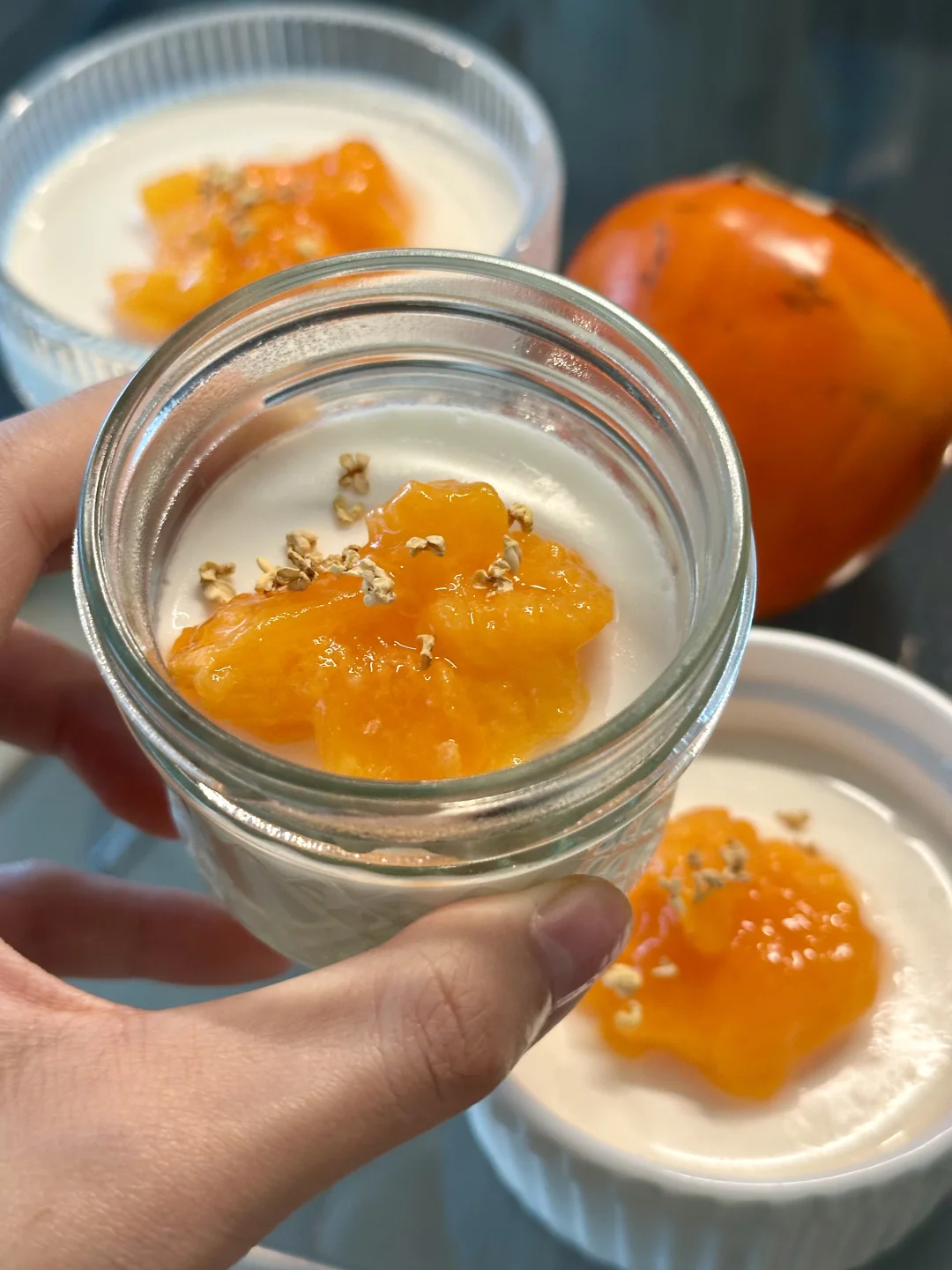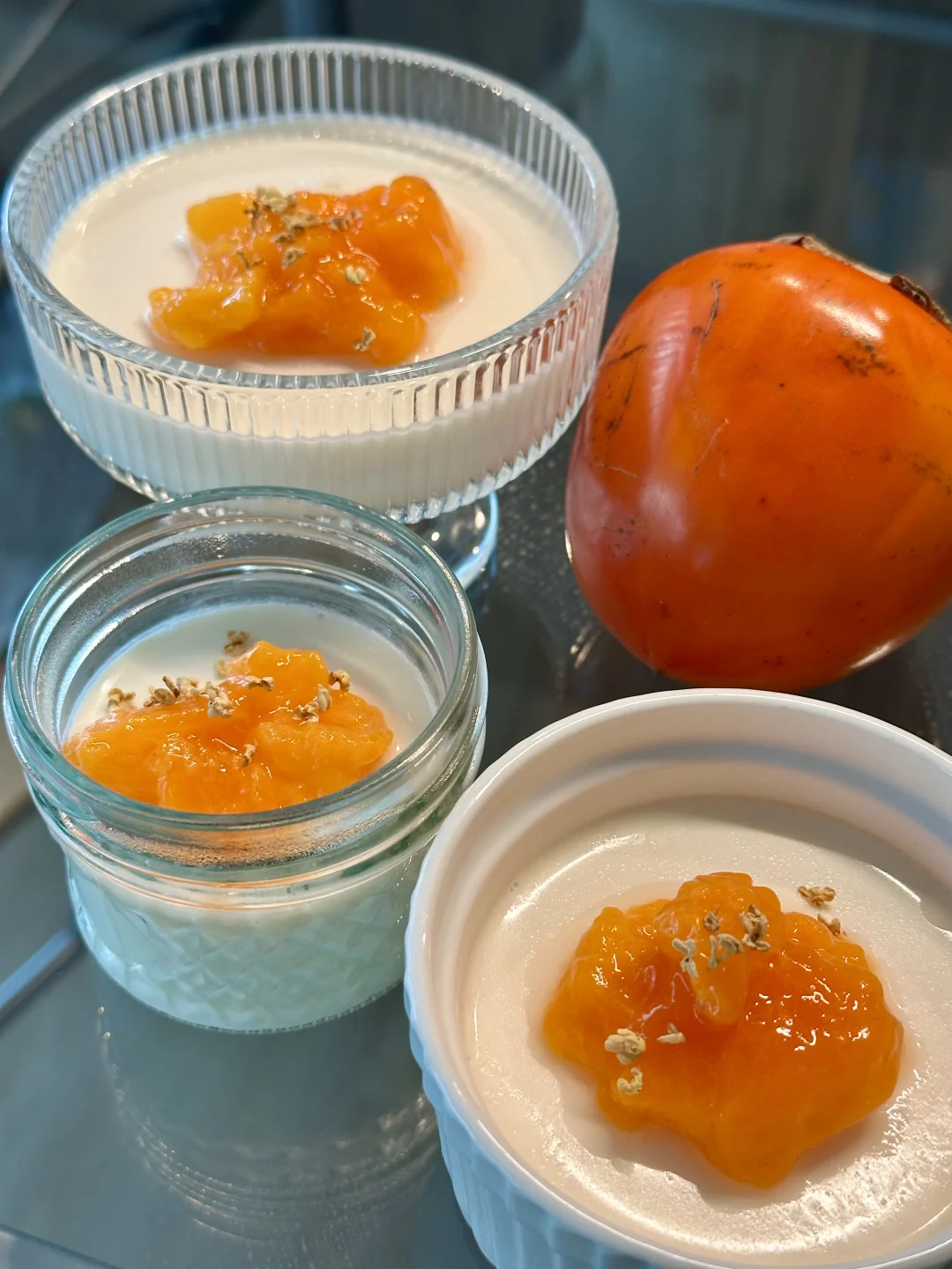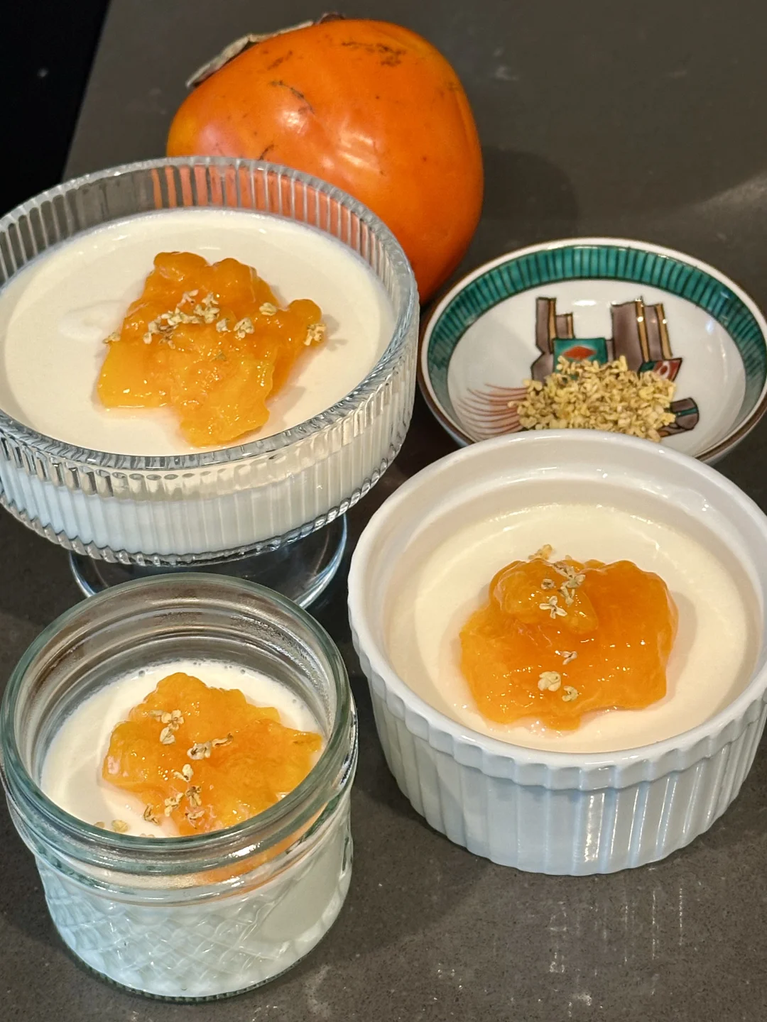 吃的时候用一枚甜柿,kuai出果肉盖在奶冻上,撒一点干桂花,就可以享用啦!