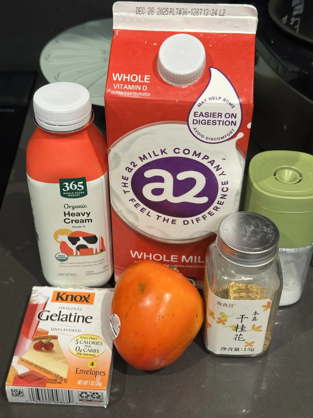 牛奶200g,桂花适量,淡奶油70g,白砂糖15g,吉利丁7g,柿子一个。