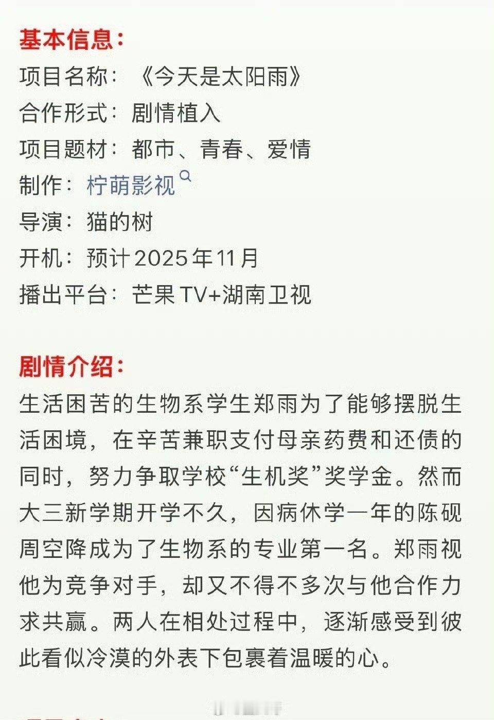 杨超越今天是太阳雨11月25日广州开机。新剧导演猫的树,男主董思成。杨超越大概率一番,所以说。超越妹妹这次要单人扛剧了嘛~