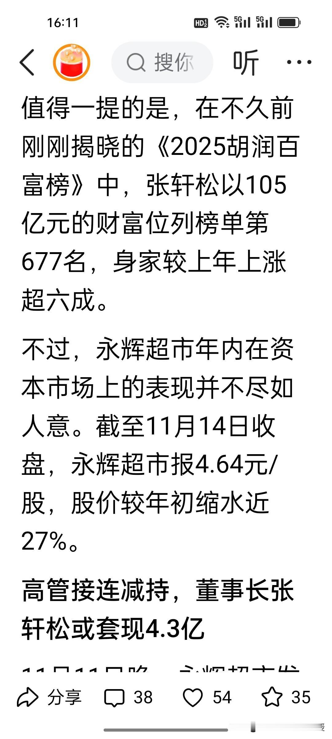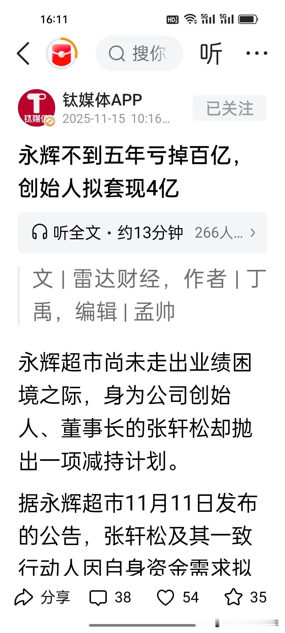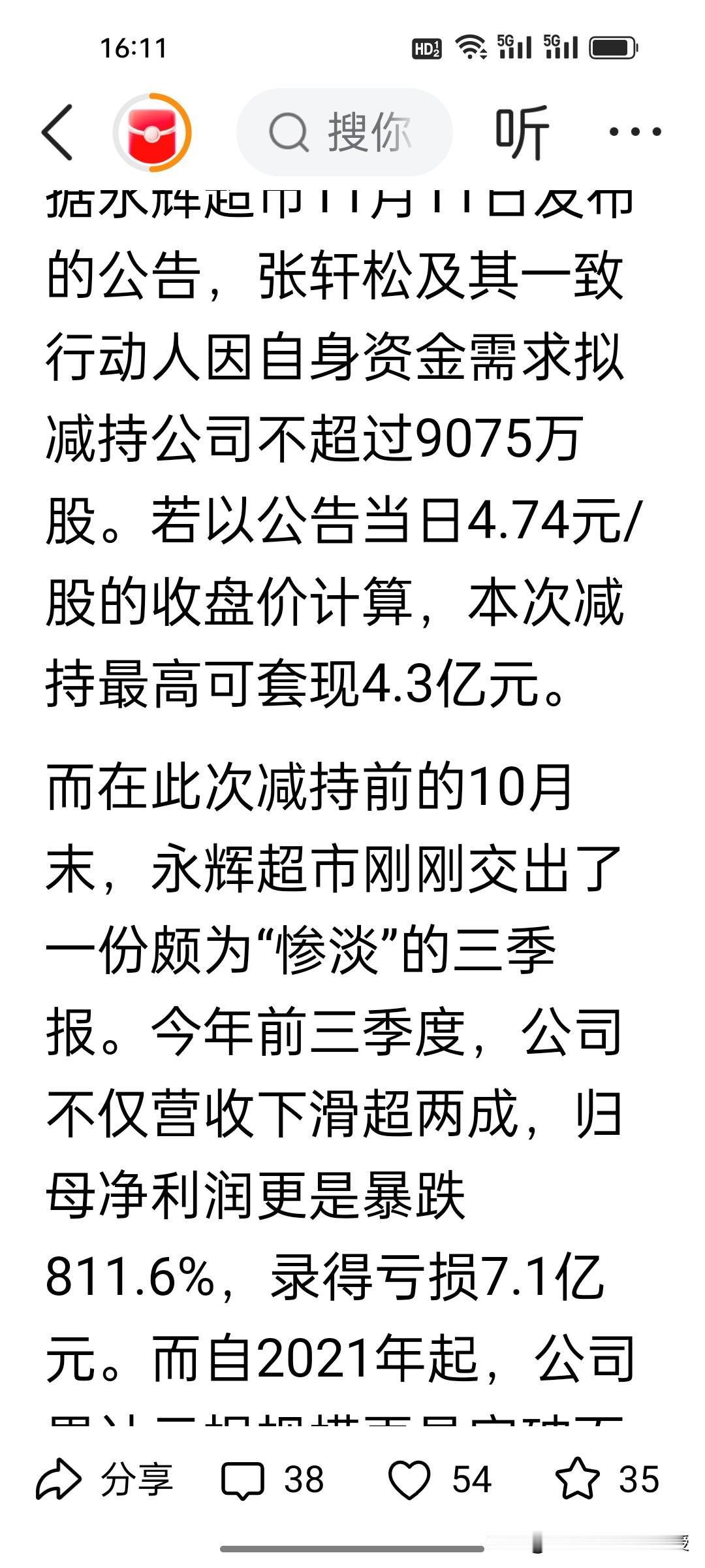 股市真的就是提款机?永辉超市四年多亏了102亿,现在又要定增31亿进行公司大刀阔斧的改革,创始人张轩松却因个人资金需求在这个节骨眼上要套现4.3亿元。 根据《钛媒体》报道,永辉超市在胖东来改造下,三季报亏了7个亿,净利润同比下滑811%,就在这么糟糕的业绩之下,股价也在地板价上,创始人不但不增持公司股份,反而要套现4.3亿元,这神操作又要让永辉超市股价再创新低?要知道张轩松于2023年3月才刚刚减持套现了3亿元。 今天看到宁德时代核心创始人减持套现184亿,宁德时代是一直赚钱的,永辉可不同,一边是亏损要再融资进行公司改革,一边创始人又套现离场,留下30万中小股东无所适从。