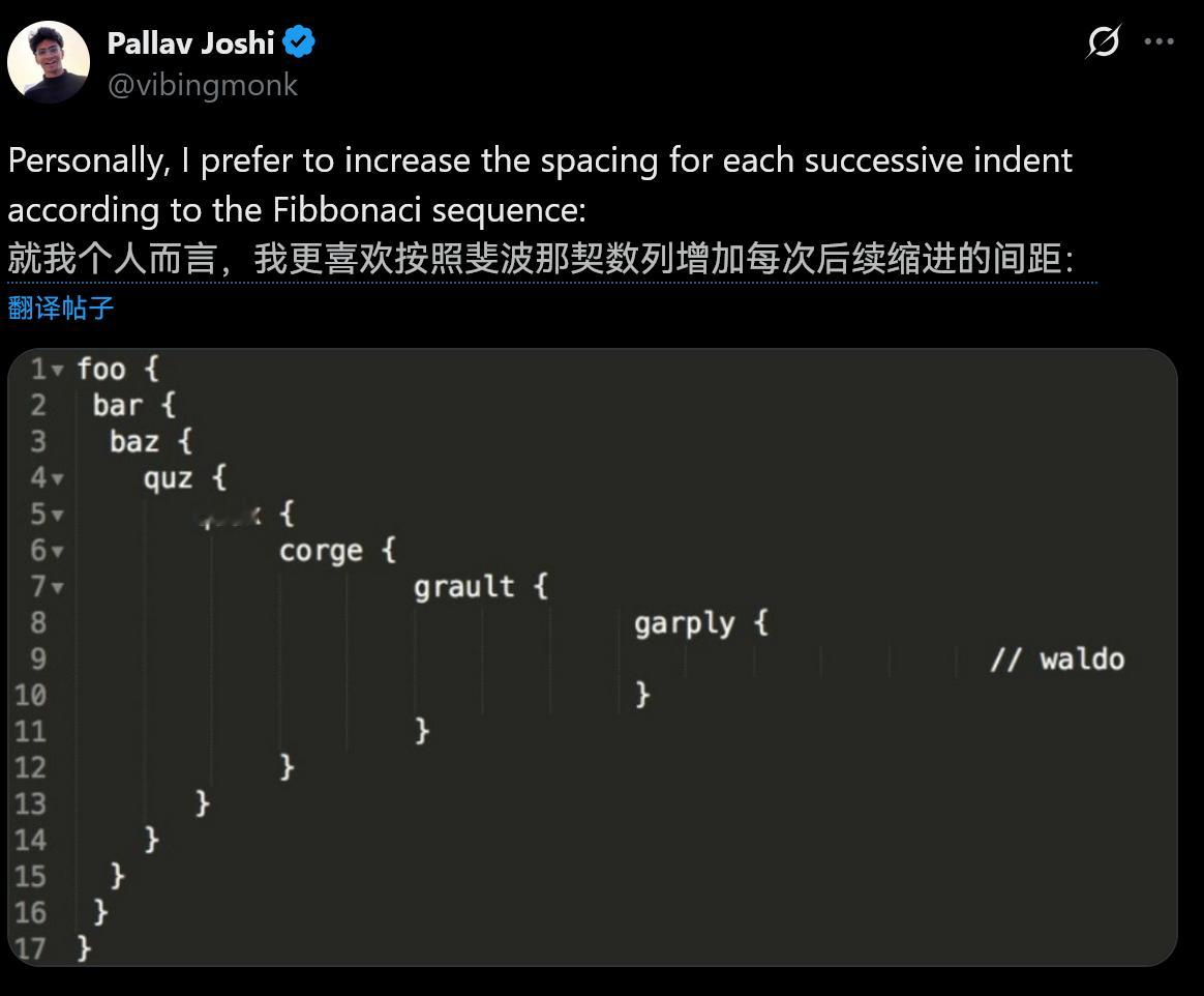 按斐波那契数列来缩进其实蛮好,可以提醒你不写圈复杂度过高的代码。。