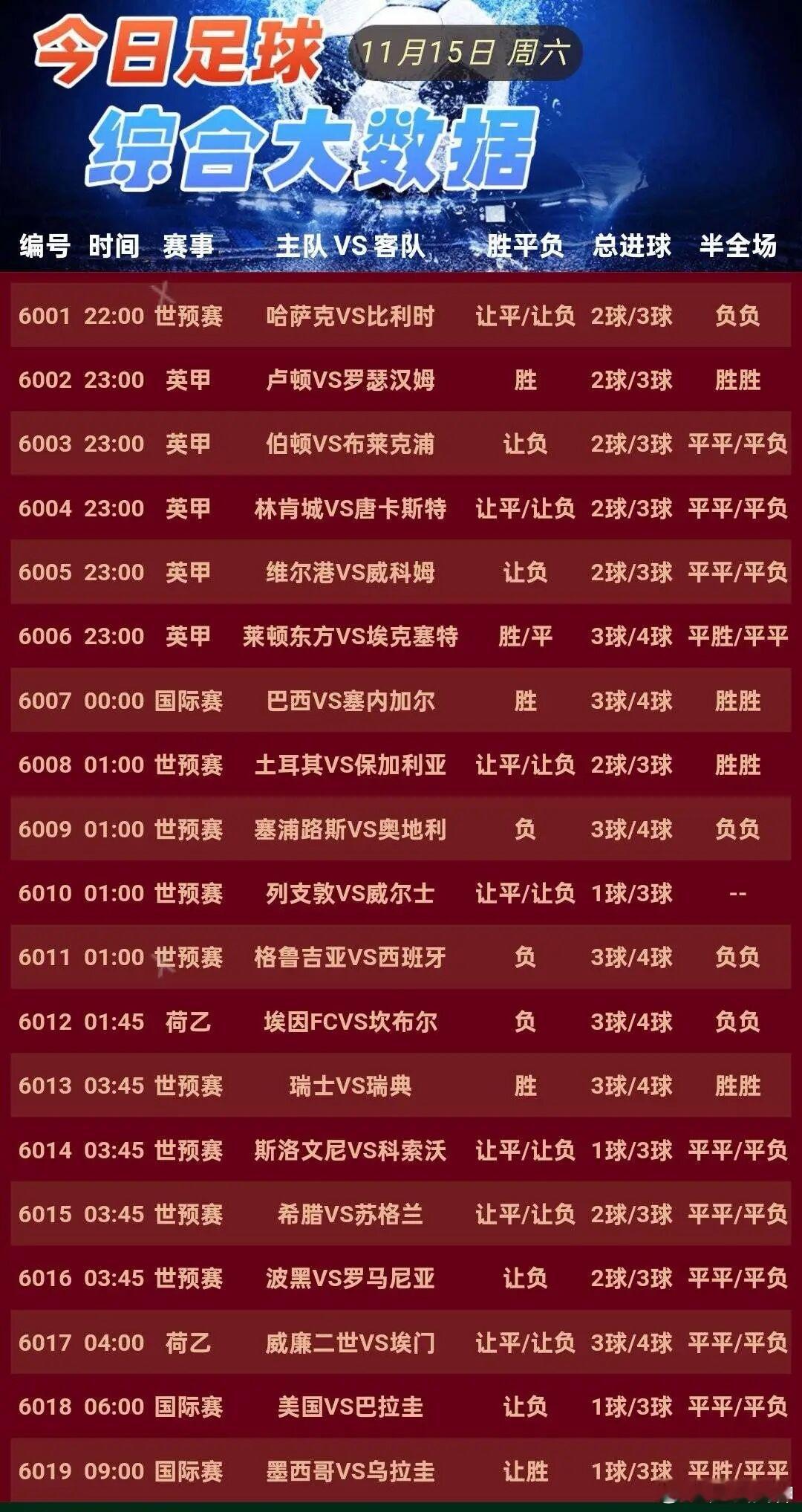11月15日001哈萨克斯坦VS比利时002卢顿VS罗瑟汉姆003伯顿