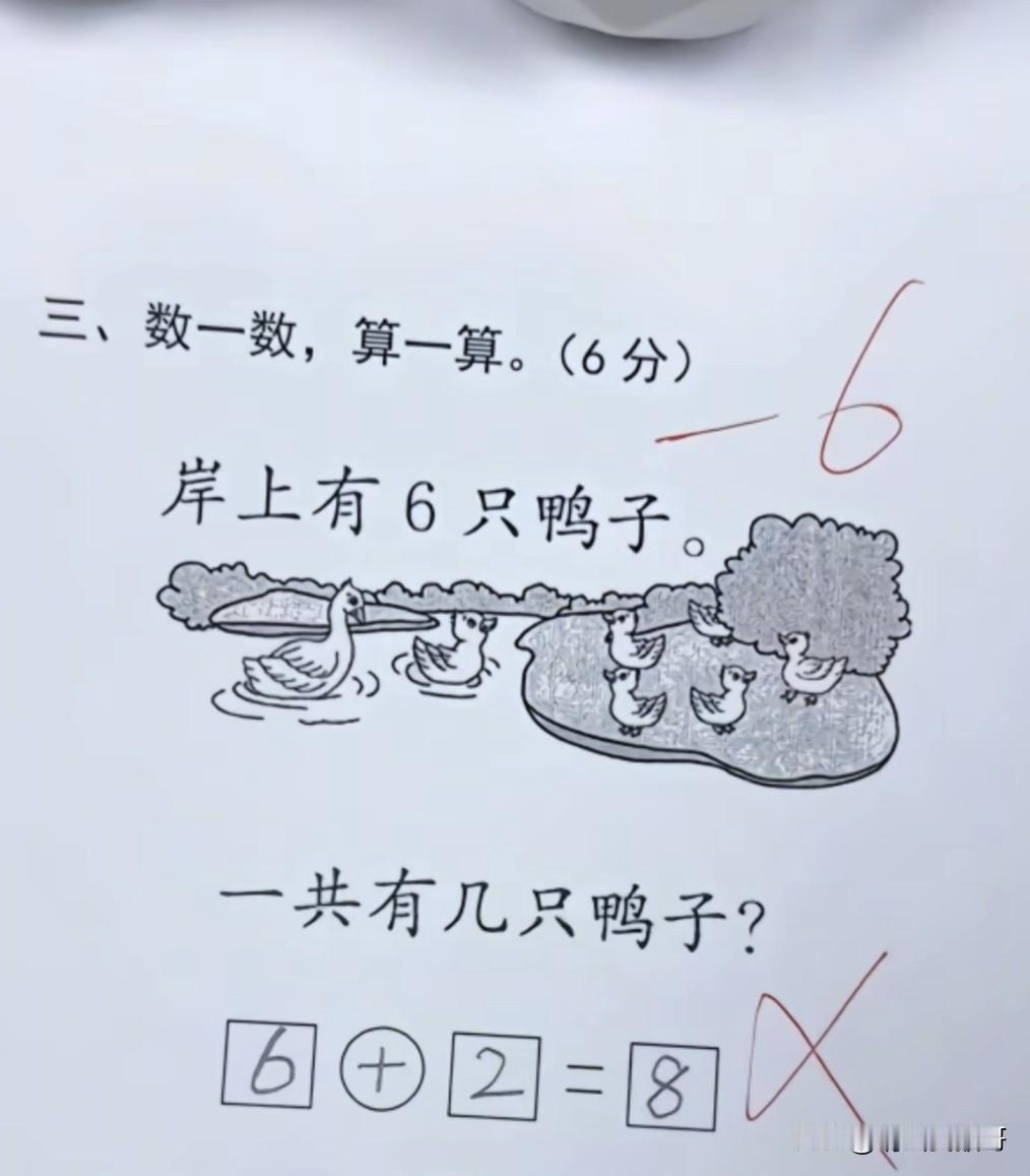现在的小学数学题 据说标准答案是6+1=7 因为水里那个脖子长的是鹅。