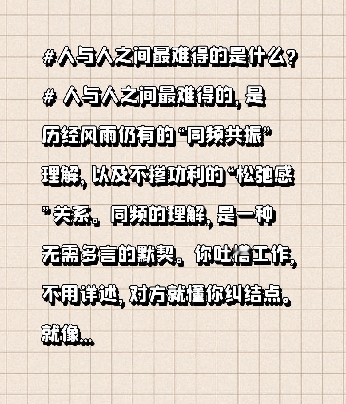 人与人之间最难得的是什么? 人与人之间最难得的,是历经风雨仍有的“同频共振”理解,以及不掺功利的“松弛感”关系。 同频的理解,是一种无需多言的默契。你吐槽工作,不用详述,对方就懂你纠结点。就像你说“没事”,他能分辨真假。这种懂,比千言万语安慰都珍贵。 而松弛感的关系,相处时不用装样子。和发小坐着啃瓜子不说话也舒服,不用刻意接话题、讨好。同时,真心待他人,却不执着于关系。你来我欢喜,你走我自在,坦然接受生命的流动,尊重彼此的航道。