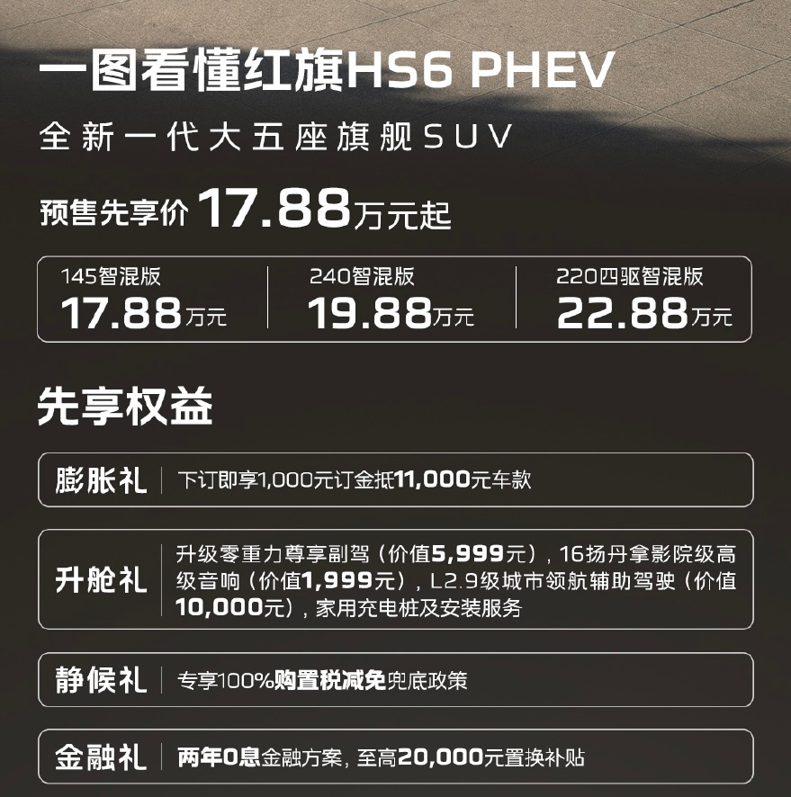 红旗HS6 PHEV开启预售,预售价17.88万元-22.88万元。新车是基于红旗“鸿鹄”混动平台打造的一款大五座SUV,长宽高和轴距分别为4925/1970/1740/2925mm,后备厢容积可从503L扩展至1977L。这样的空间对于有宝宝有老人的多口之家来说,简直太合适了。动力方面,红旗HS6 PHEV搭载1.5T插混系统,提供前驱和四驱两种选择,四驱版本的系统综合功率高达502马力,百公里加速仅需4.7秒,快充模式下电量从20%充至80%仅需约14分钟。续航方面,尽管该车的CLTC纯电续航为248km,综合续航1650km,但却创下了2327.343km的吉尼斯极限续航里程纪录,这你受的了吗?日常用车成本也亲民,纯电续航覆盖上下班通勤,每公里成本才 3 毛钱,工薪奶爸也能轻松承担。14 分钟快充超方便,下班顺路充会儿电,第二天带娃出门满血复活,再也不用为续航焦虑~
