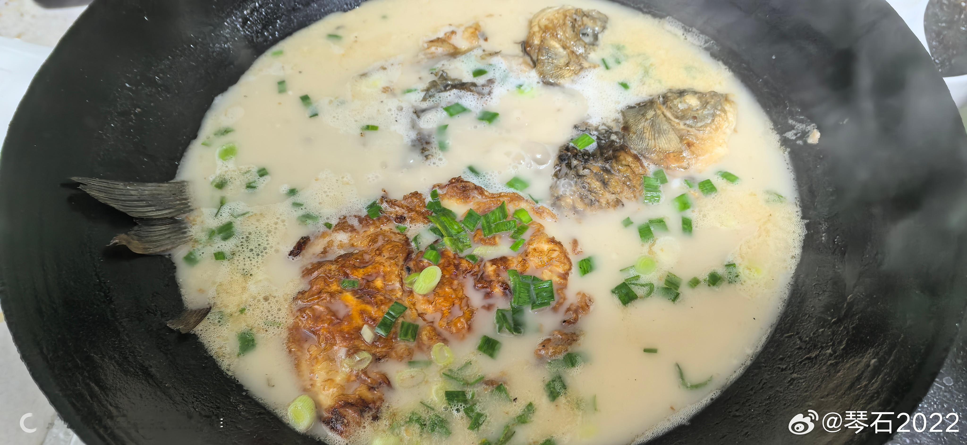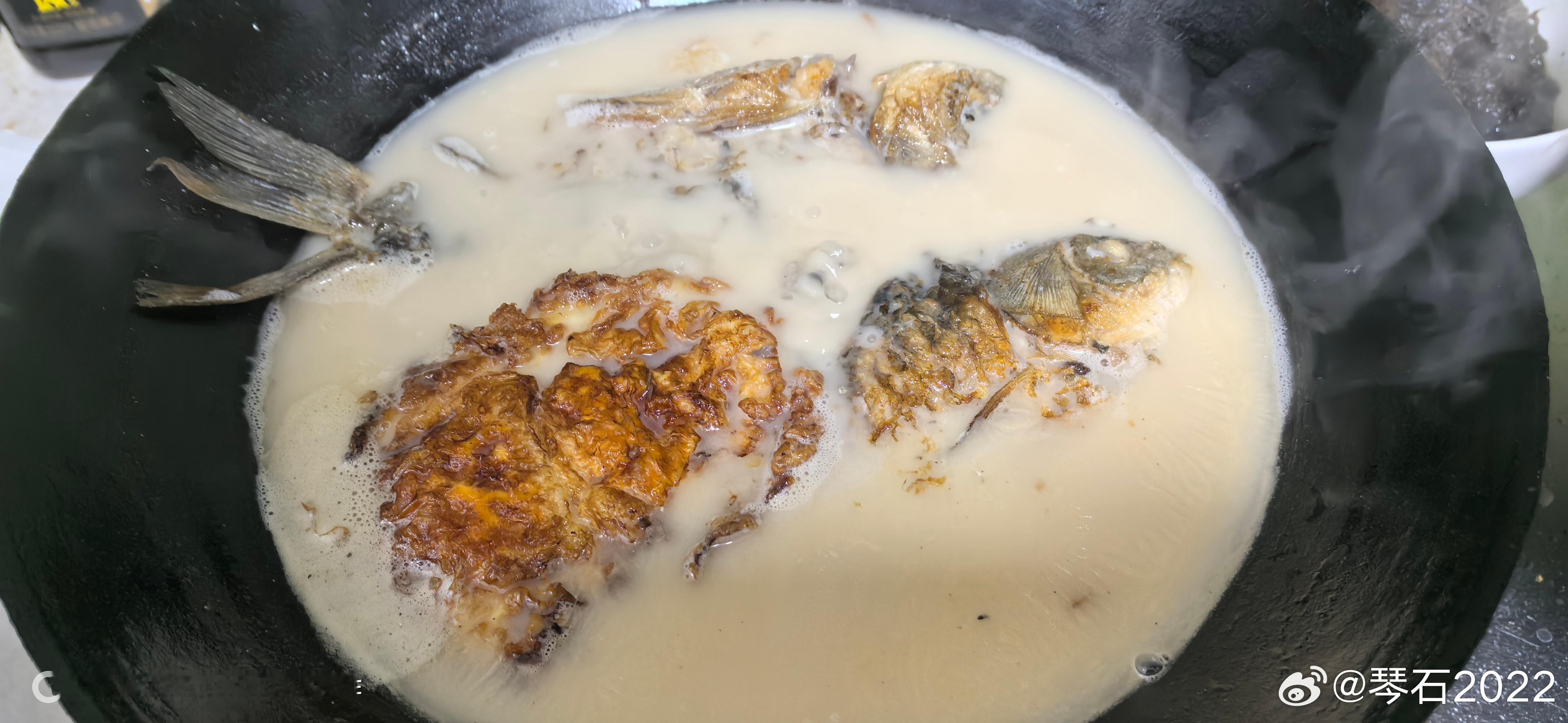 昨天剩的两条,煮了一个荷包蛋鲫鱼汤只有姜片、胡椒粉、盐、青白蒜叶,没有其它。对于爱吃鲫鱼的她来说,轻松拿捏