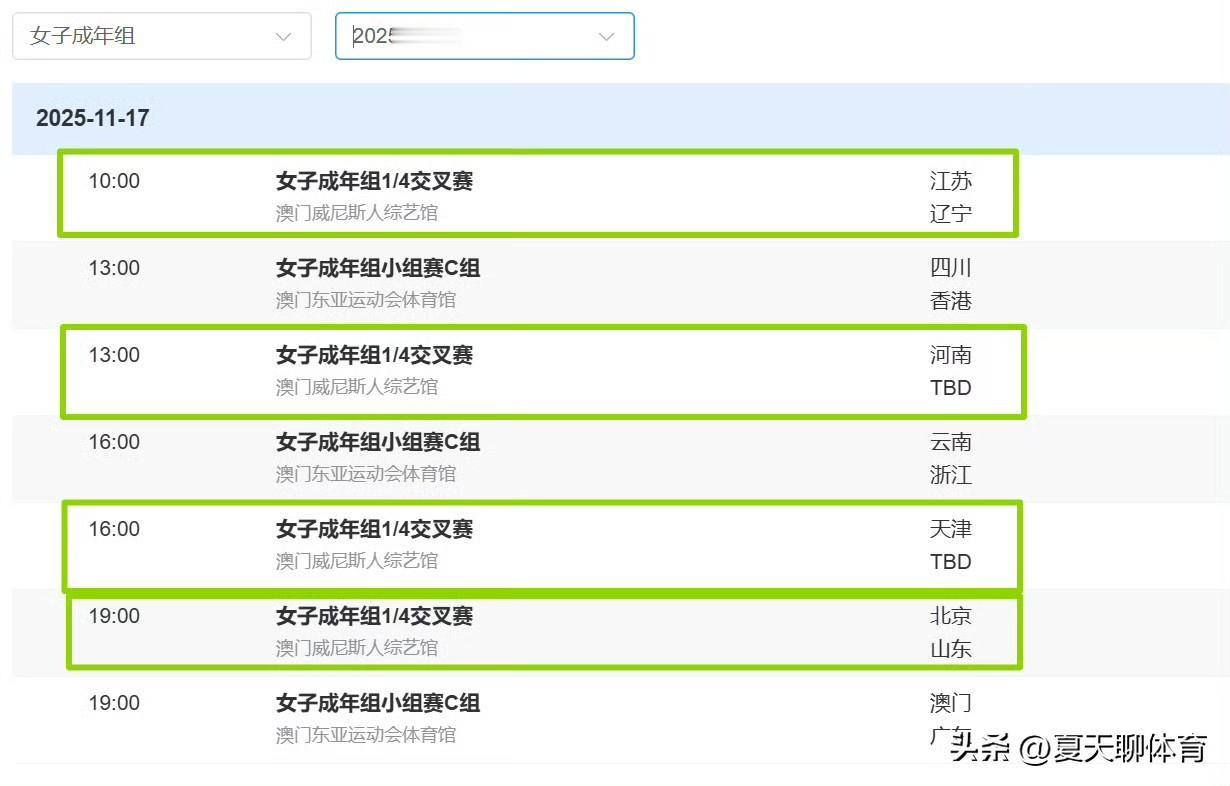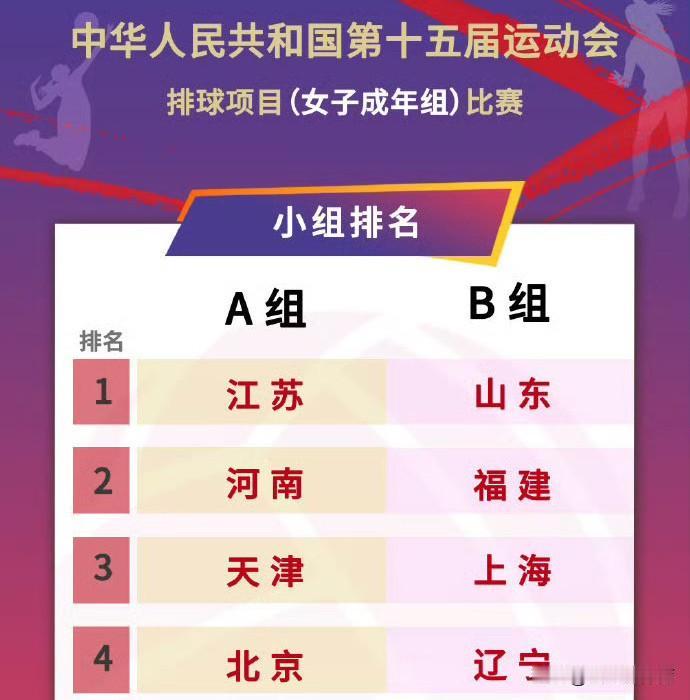 全运会女排1/4决赛对阵出炉!朱婷所在的河南女排迎战上海女排,1/4决赛时间安排在周一中午13:00,福建女排由于下午输给了浙江女排一局,然后要去跟卫冕冠军天津女排掰腕子,16:00开始!到了淘汰赛都不好打啊,一场定输赢,感觉B组这四支队伍,能留下来的可能就山东女排了! 11.17号周一 10:00 江苏vs辽宁 13:00 上海vs河南 16:00 福建vs天津 19:00 山东vs北京