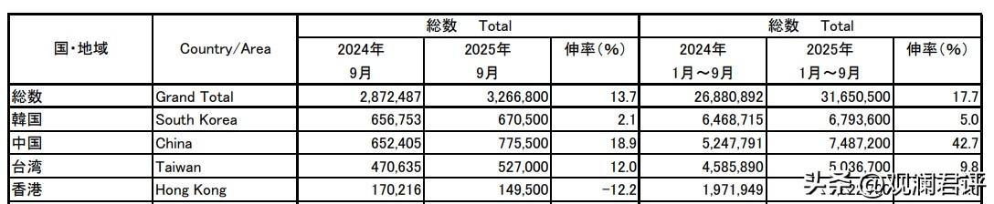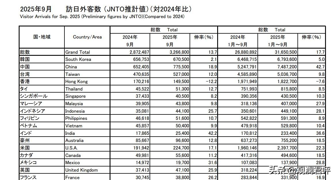 这是日本观光局发布的外国入日人数统计,。其中,2025年9月XX入日人数77万,同比增长18.9%;2025年1—9月XX入日人数748万,同比增长43%。 可以看看后续统计数据,不知道民众用脚的投票是不是符合主流预期。