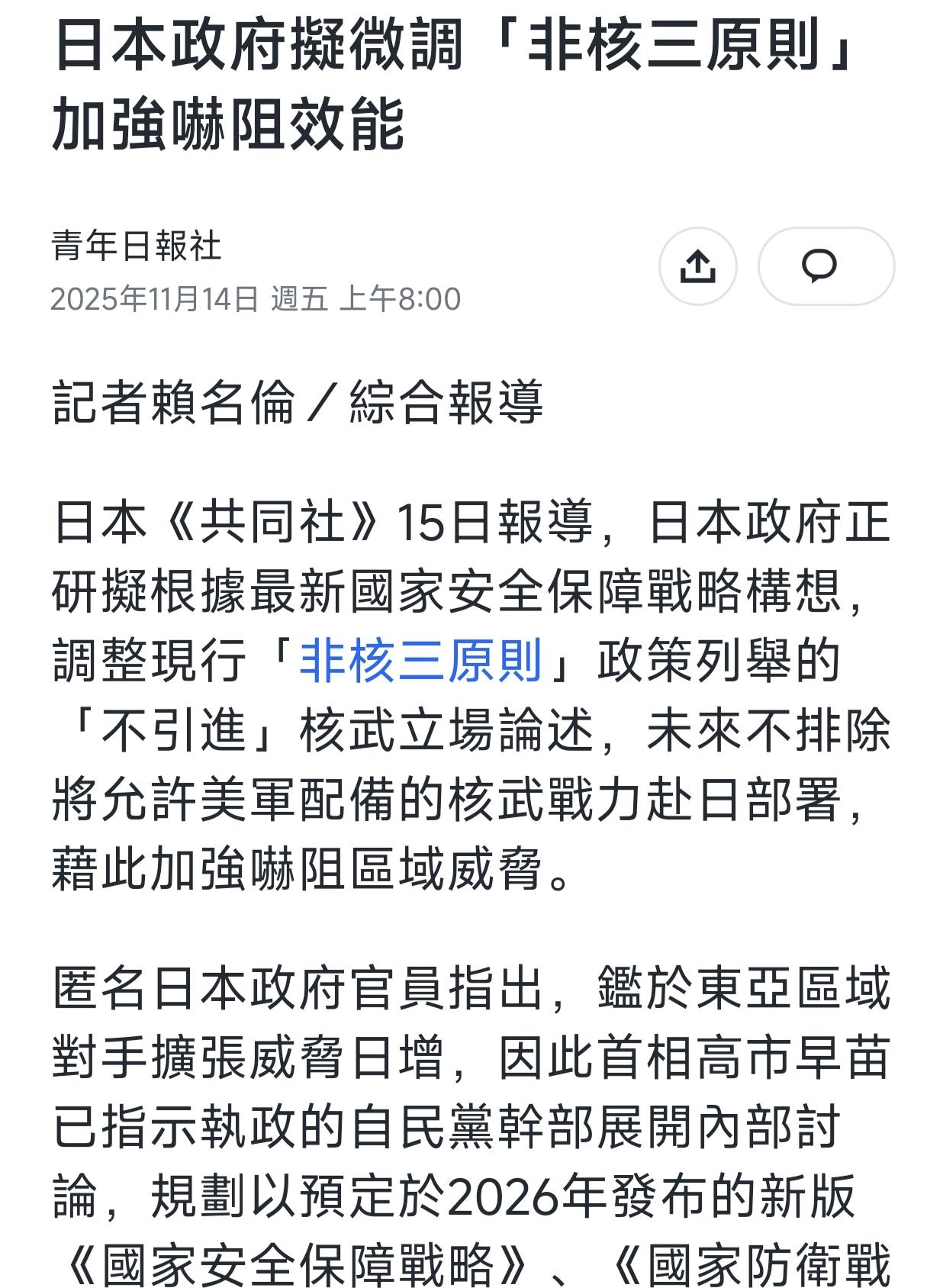 日本人要搞核武器?高市早苗太狂了,居然要讨论非核三原则!“非核三原则”自1967年提出以来,要求日本“不持有、不制造、不允许他国携带核武器入境”,历届内阁均表示坚持。但高市首相近期在国会被问及是否继续坚守该原则时并未明确表态。她强调三份安保文件即将启动全面审议,目前尚不便说明写法。 消息人士称,高市政府重视日本已加入《核不扩散条约》(NPT)的立场,仍拟继续坚持“不持有、不制造”两项原则,但对“不得携入”持保留态度!
