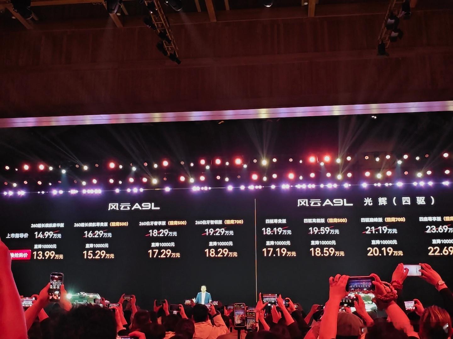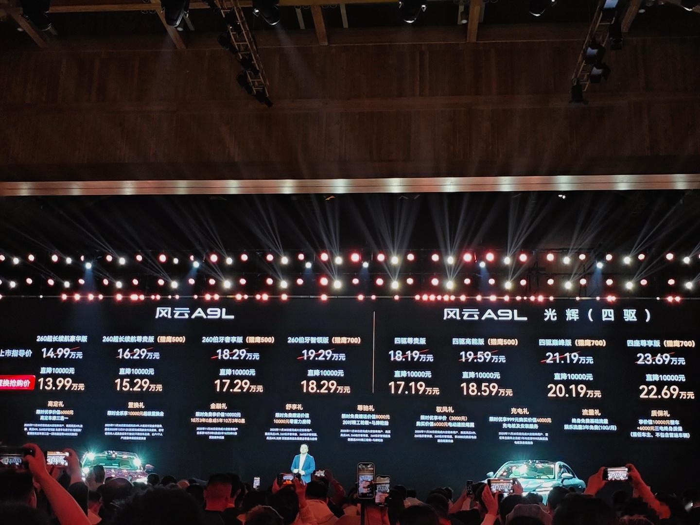 风云A9L的冷暖箱有点东西,13.7L容积,重点是温度区间达到了-18℃~50℃,相当于说达到了冰冻水平。价格方面,入门的260超长续航豪华版售13.99万起,搭载猎鹰700的260伯牙智领版售18.29万,A9L光辉四驱尊贵版售17.19万起,搭载猎鹰700 + 四座的尊享版售22.69万,杨紫竟然也来了,这价格心动吗