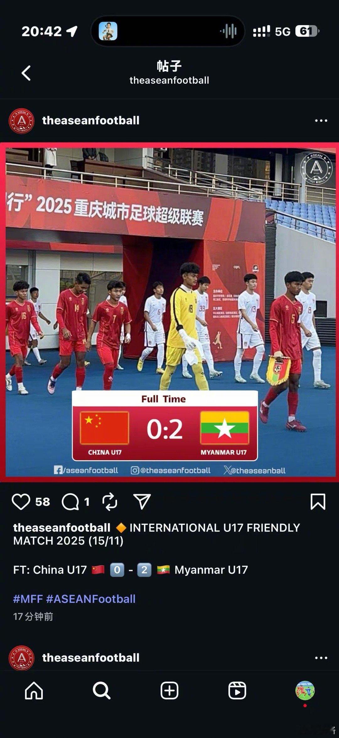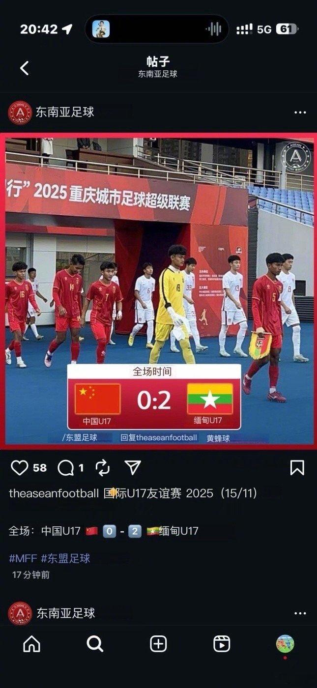 “东南亚足球”发布消息:中国U16国少热身赛0:2缅甸🇲🇲