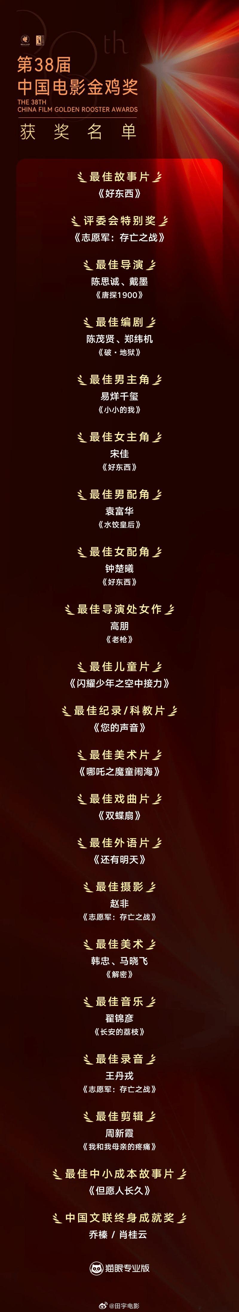 第38届中国电影获奖名单完整版出炉,是你心目中的电影和电影人么?欢迎来评论区聊聊📢最佳故事片:《好东西》评委会特别奖:《志愿军:存亡之战》最佳导演奖:陈思诚、戴墨 《唐探1900》 最佳男主角:易烊千玺(《小小的我》饰演刘春和) 最佳女主角:宋佳(《好东西》饰演王铁梅)最佳女配角:钟楚曦(《好东西》饰演小叶)最佳男配角:袁富华(《水饺皇后》饰演糖水伯)最佳编剧奖:陈茂贤、郑纬机《破·地狱》(原创)最佳摄影奖:赵非《志愿军:存亡之战》最佳音乐奖:翟锦彦《长安的荔枝》最佳美术奖:韩忠、马晓飞《解密》最佳剪辑奖:周新霞《我和我母亲的疼痛》 最佳录音奖:王丹戎《志愿军:存亡之战》最佳外语片奖:《还有明天》(意大利)最佳纪录/科教片奖:《您的声音》最佳导演处女作奖:高朋《老枪》最佳中小成本故事片奖:《但愿人长久》最佳戏曲片奖:《双蝶扇》(闽剧)最佳美术片奖:《哪吒之魔童闹海》最佳儿童片奖:《闪耀少年之空中接力》中国文联终身成就奖:乔榛、肖桂云