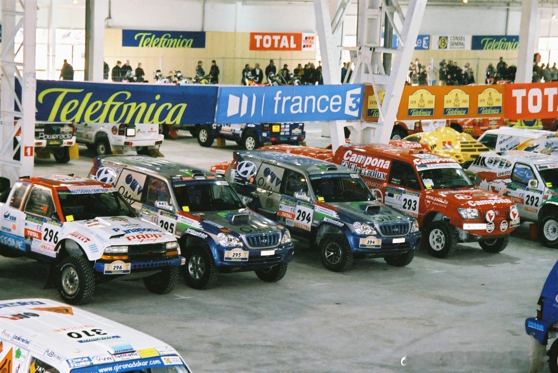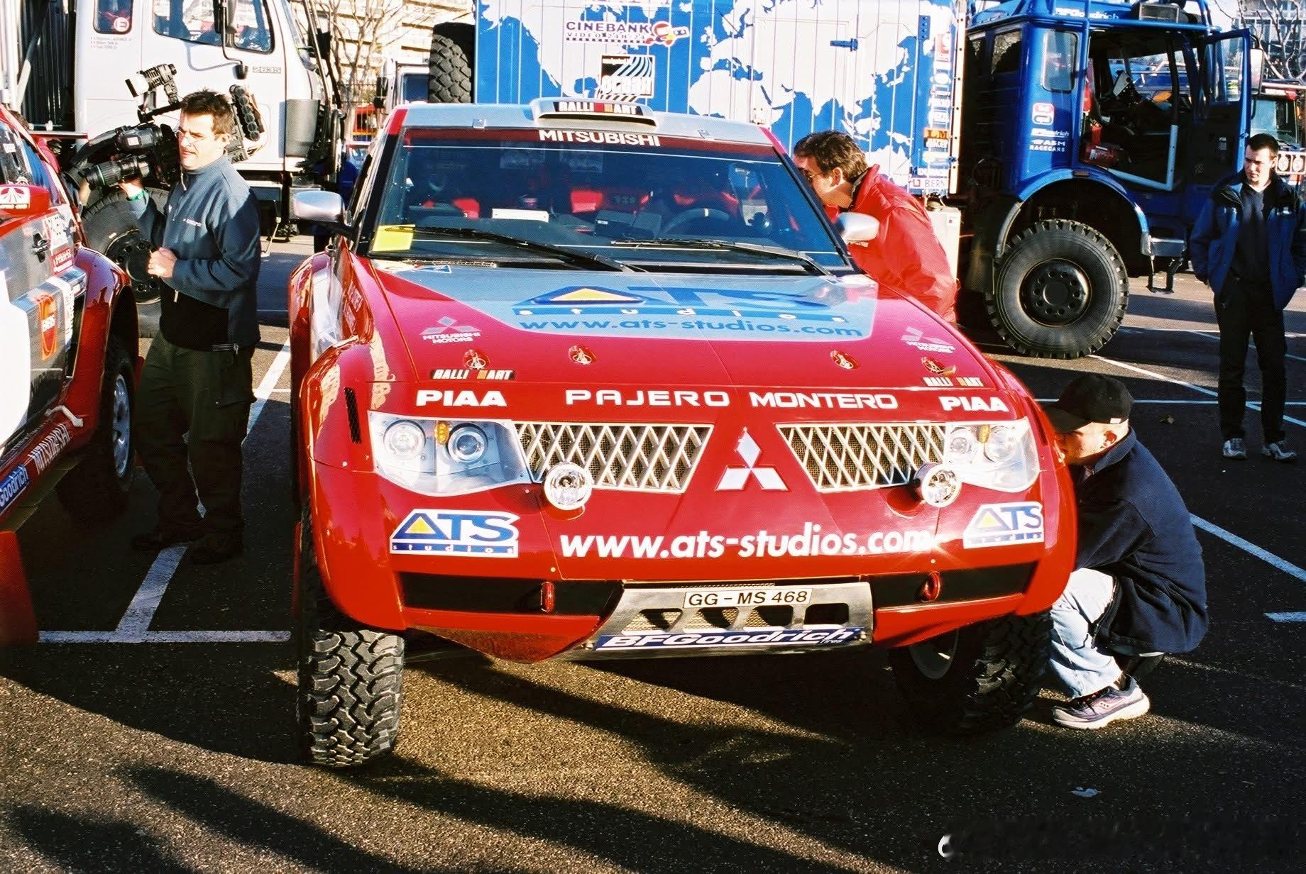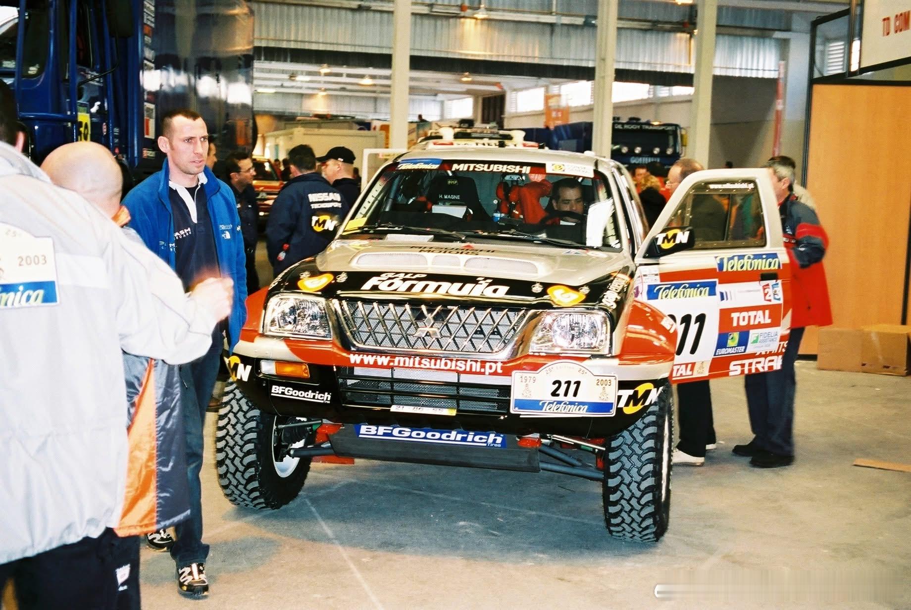 老照片~来自2003年巴黎达喀尔拉力赛,出车前的老照片,哪时欧洲的SUV车型开始崛起赛场上有了bba的身影甚至沃尔沃也开始参加,三菱系列在达喀尔拉力赛中正是巅峰时,日本车手增冈浩与领航员舒尔兹,驾驶三菱赛车夺冠。