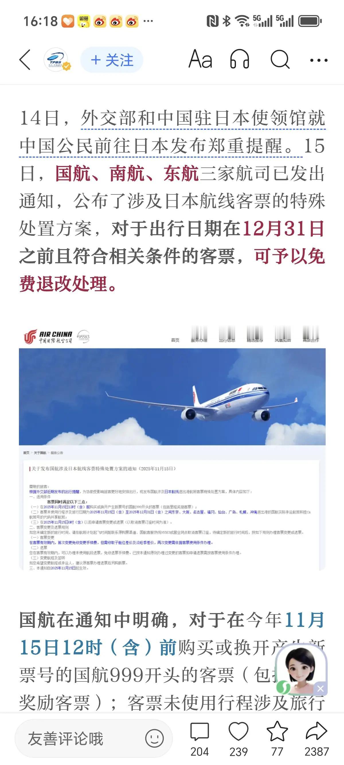 大快人心!对日制裁来了!国航、南航、东航:涉日本机票可免费退改! 最近,一条振奋人心的消息刷爆了网络:随着中日关系因一系列摩擦持续升温,中国多家大型航空公司宣布,涉及日本路线的机票将可免费退改!国航、南航、东航纷纷跟进,显示出强烈的态度和坚定的立场。 这不仅是一纸简单的退改规定,更是国家意志和民族情绪的集中体现。过去,无数奋战在一线的基层员工、普通旅客,都因种种原因买了往返日本的机票,面对如今复杂严峻的政治氛围,能获得免费退改权利,无疑给了大家一份安心与尊重。 这项政策释放出的信号非常明确:拒绝被动绥靖,勇敢维护国家尊严!面对外部的挑衅和不友好行为,不盲目迁就、不委屈自己,是每个中国人的权利和责任。航企的这一举措,无疑是实实在在对国人诉求的积极回应,更显示出企业与国家统一战线的坚强决心。 从人性角度来看,旅游本该是释放压力、享受美好生活的方式,但当民族情感与国家利益受到威胁时,选择退票成为一种理智且有力的表达。我们看到的是人们在保持开放心态的同时,更多了份对祖国的忠诚和爱护。 这背后更反映出一个真理:经济往来虽重要,但国家尊严不可侵犯。任何时候,团结和自尊都是民族前进最坚实的基石。此刻,国航、南航、东航的免费退改政策,不仅保障了旅客权益,也为社会传递了一股正能量—坚守底线,才能赢得更多尊重。 对此,许多网友纷纷留言:“终于有了实质保障!”“什么时候都不能丢掉底线。”“支持退票,也支持国家立场!”还有人坦言,这才是真正让人安心的公司行为。 当然,也有人好奇,这一政策会否影响未来中日经济交流?正因如此,更加需要理性审视,既不能任由冲突激化,也要保持足够清醒,防止损害自身利益。 你怎么看这次航司的免费退改?是不是你心底最期待的回应?日本相关机票退票的故事,你有怎样的经历和感受?欢迎在评论区大胆吐槽,一起为维护国家尊严呐喊助威!中方正告日本 国航日本航班
