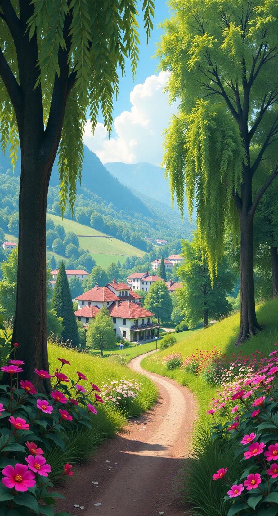 上联:山溪水涨潭鱼跃;白云邀对。下联:林间鸟鸣林果香;青松伴对。