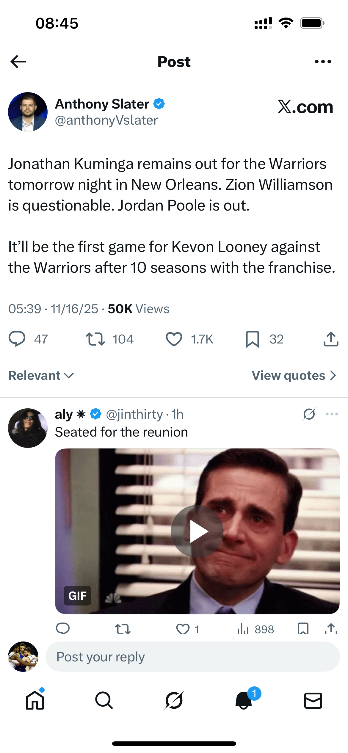 明天勇士对阵鹈鹕,库明加继续缺席,普尔也不打,鲁尼生涯第一次面对旧主勇士