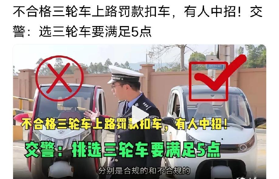 违规三轮车上路罚款扣车,有人中招!交警:买三轮车注意5点 “刚买的三轮车,开着去拉菜就被拦了,又罚款又扣车,太亏了!”最近不少街坊因买错三轮车中招,本想图个拉货、代步方便,反倒惹了麻烦。交警特意给百姓提了醒,买三轮车前记好这5点,别踩坑! 1. 先查“合规资质”,别买“三无车”。必须选有正规生产手续的,能看到3C标识和出厂合格证,没这些的车再便宜也别要,上路准被查。 2. 确认“能上牌”,无牌开不了。得选能在车管所登记上牌的车型,问清商家能不能帮办,没牌照上路肯定挨罚。 3. 驾照不能少,该考就得考。只要是用来拉货或时速超20公里的三轮车,就得有对应驾照,无证开不光罚钱,出事还担责。 4. 必买“交强险”,出事有保障。上牌前得买好交强险,这是硬性要求,没保险不光上不了牌,路上被查也得扣车。 5. 别信“随便开”,商家话术别当真。商家说“不用牌不用照”都是忽悠,自己对照要求核实,别图省事吃大亏。 买三轮车图的是方便,记好这5点,选合规车、办齐手续,才能安心用,不被罚款扣车。严查三轮电动车