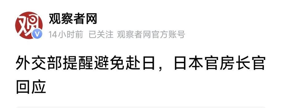 外交部发出提醒,建议避免前往日本,对此日本官房长官做出回应:日中之间存在分歧,各层次的交流更为重要!外交部提醒大家近期别去日本,这是事出有因的。今年日本治安状况不佳,针对中国公民的犯罪案件频繁发生,不少在日中国公民遭遇袭击,有些案件至今仍未侦破。并且日本领导人公然发表涉台挑衅言论,严重破坏了人员交流的良好氛围,威胁到了在日同胞的安全。 日本官房长官木原稔称“正因为立场不同,日中多层次沟通才更重要”,这话听起来就像是在打官腔。日本自民党政调会长表示要冷静对话,可他们领导人的不当言论又该作何解释呢?今年1 - 9月有748万中国游客前往日本,倘若真因这一系列事件导致游客数量减少,日本商业恐怕会受到影响。我们还是应该将安全摆在首位,听从外交部的提醒准没错。