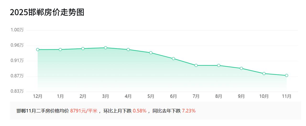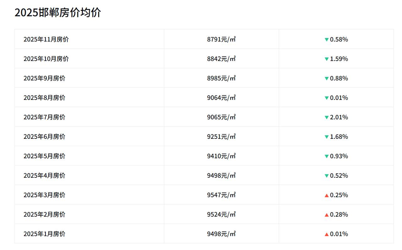 2015年10月,邯郸房价均价5961元; 2016年10月,邯郸房价均价6376元; 2017年10月,邯郸房价均价8471元; 2018年10月,邯郸房价均价9781元; 2019年10月,邯郸房价均价10000元; 2020年10月,邯郸房价均价10163元; 2021年10月,邯郸房价均价10209元; 2022年10月,邯郸房价均价10156元; 2023年10月,邯郸房价均价10399元; 2024年10月,邯郸房价均价9397元; 2025年10月,邯郸房价均价8842元。   回头看,邯郸楼市这十年经历了三个明显阶段: 2015-2018年的快速上涨期、2019-2023年的高位盘整期和2024-2025年的调整回归期。   房价最高是2017年,同比暴涨32.86%,一年涨了超过30%。那时候的售楼部估计挤都挤不进去。紧接着2018年再涨15.46%,房价逼近万元大关。   2019年是转折点,房价首次突破万元,但涨幅已明显收窄。随后几年,房价在万元上下震荡。邯郸楼市,市场分化明显,丛台区、复兴区、邯山区三个区的销量占了总成交量的94.4%,辖区内单价从4915元到20624元都有,相差四倍多。   邯郸当前的房价,其实是对前几年过热市场的理性回归,邯郸作为京津冀协同发展战略的重要节点城市,房地产市场应该会受益于区域经济的整体提升。未来邯郸的楼市,可能成交量将保持稳定,产品品质将不断提升。